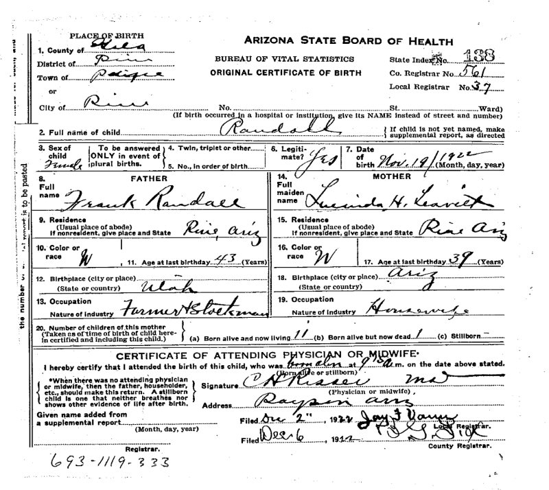 Notes for FAUN RANDALL: Daughter of Frank Campkin and Lucinda Helen (Leavitt) Randall. Born: November 19, 1922 in Pine, Gila County, Arizona. Died: July 2, 1929 in Unknown. Buried: Row 5 West; Pine Cemetery, Pine, Gila County, Arizona.