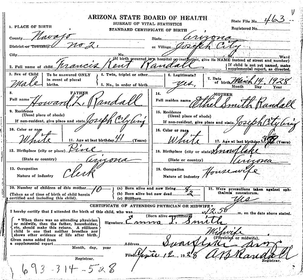Born: March 14, 1928 in Joseph City, Navajo County, Arizona.