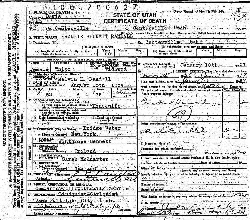 Died: January 10, 1937 in Centreville, Davis County, Utah.