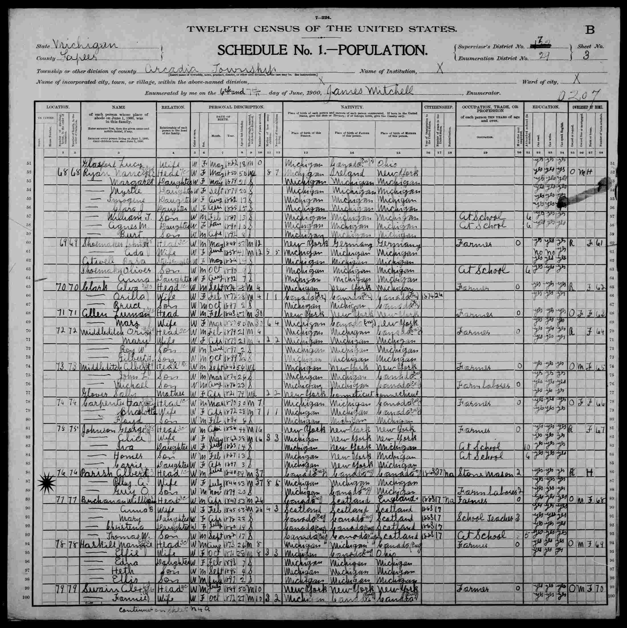June 6 & 7, 1900 - ED 29, Arcadia Township, Laper, Michigan.