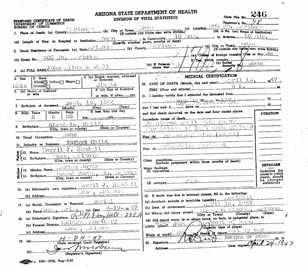 Died: April 16, 1947 in Mesa, Maricopa County, Arizona.
