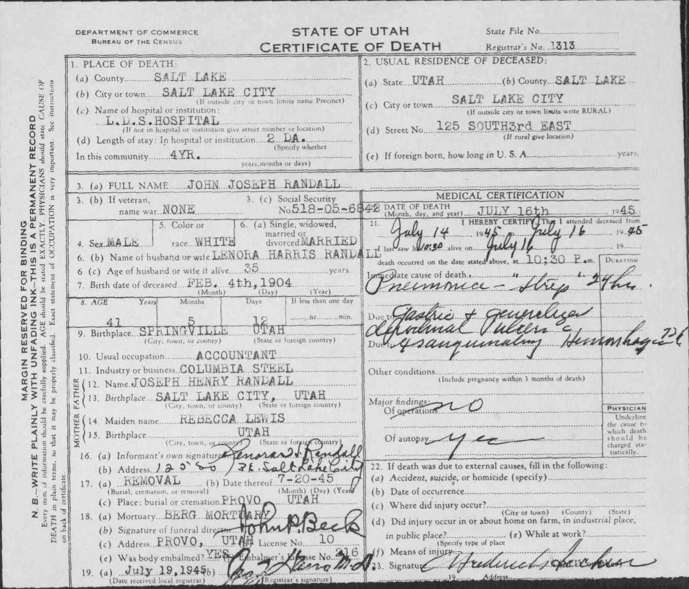Died: July 16, 1945 in Salt Lake City, Salt Lake County, Utah