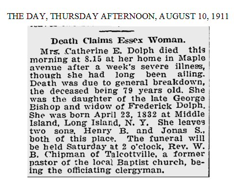 Died: August 10, 1911 in Essex, Middlesex County, Connecticut.