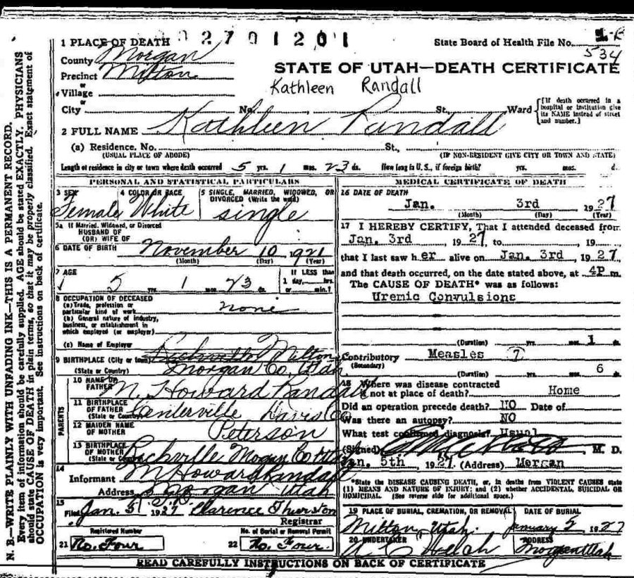 Died: January 3, 1927 in Milton, Morgan County, Utah.