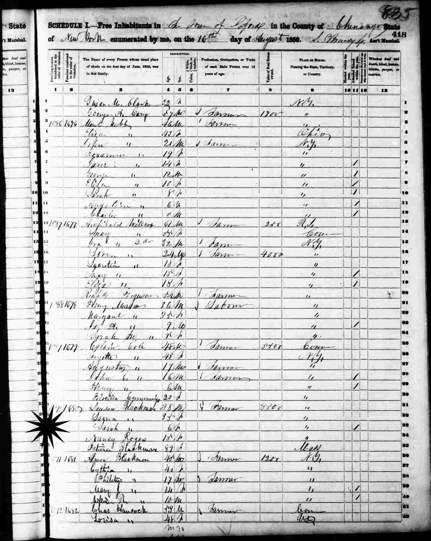Notes for LAWSON BLACKMAN: Son of ? and ?. Born: About 1812 in New York. Died: Unknown in Unknown. Census: 1850 - Oxford, Chenango County, New York. Occupation: 1850 - Farmer Married: Lucia Randall before 1843 in Unknown.