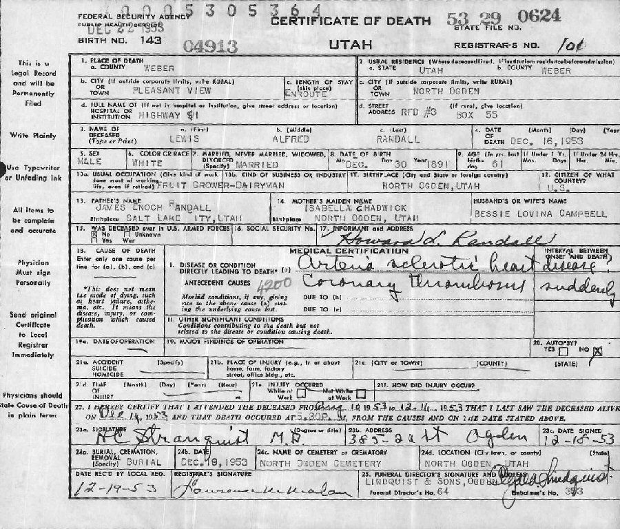 Buried: December 19, 1953 in North Ogden Cemetery, North Ogden, Weber County, Utah.