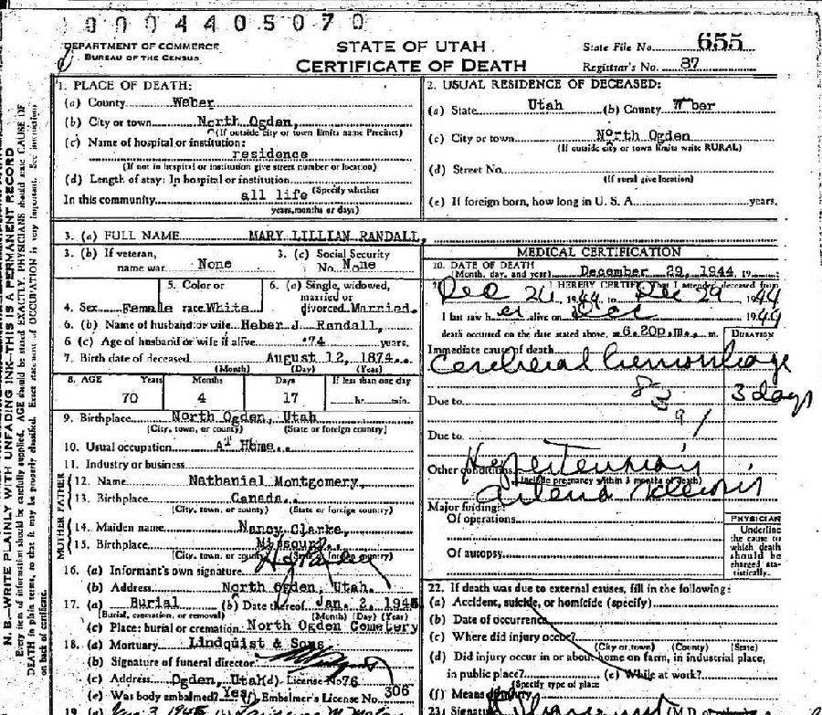 Died: December 29, 1944 in North Ogden, Weber County, Utah.