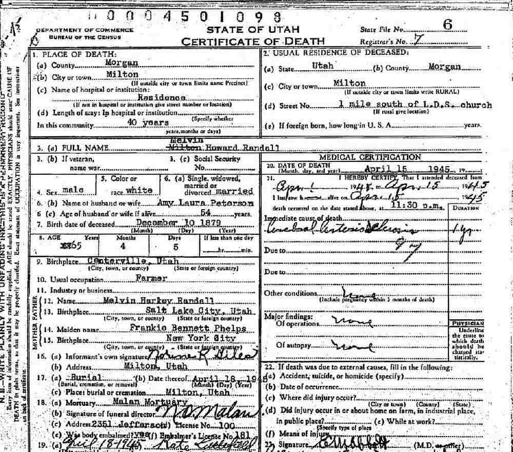 Died: April 15, 1945 in Milton, Morgan County, Utah.