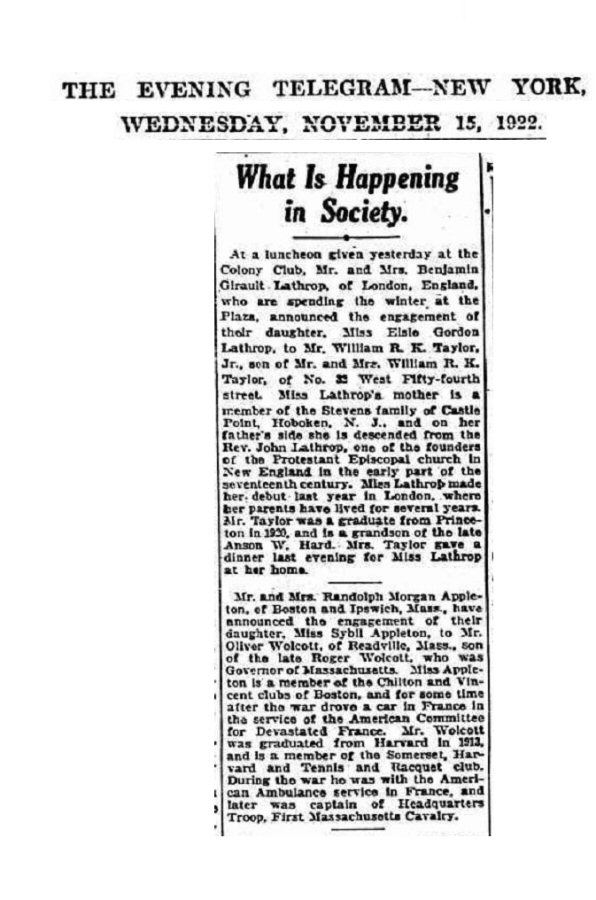 Oliver Wolcott served with the American Field Service in 1916 during World War I, and his future wife Sybil Appleton served with the American Committee for Devastated France in 1921.