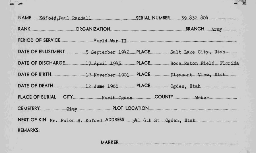 Died: June 12, 1966 in Ogden, Weber County, Utah.