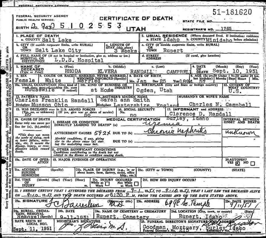 Died: September 10, 1951 in Salt Lake City, Salt Lake County, Utah.