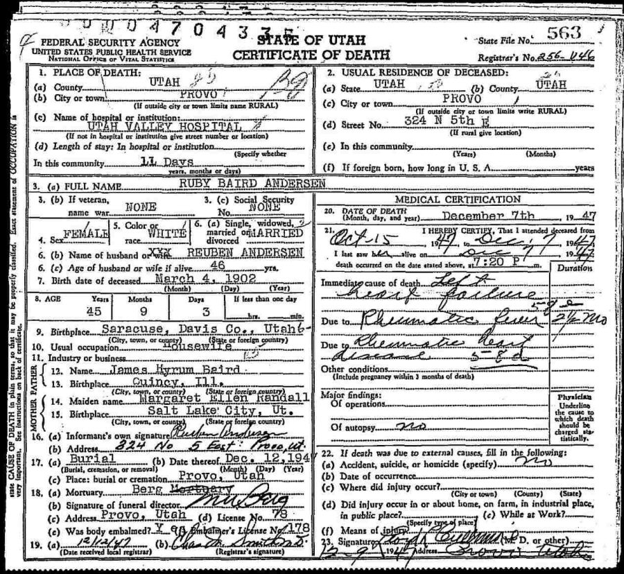 Died: December 7, 1947 in Provo, Utah County, Utah.