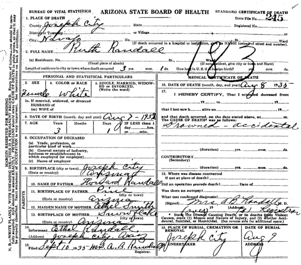 Died: August 8, 1935 in Joseph City, Navajo County, Arizona.