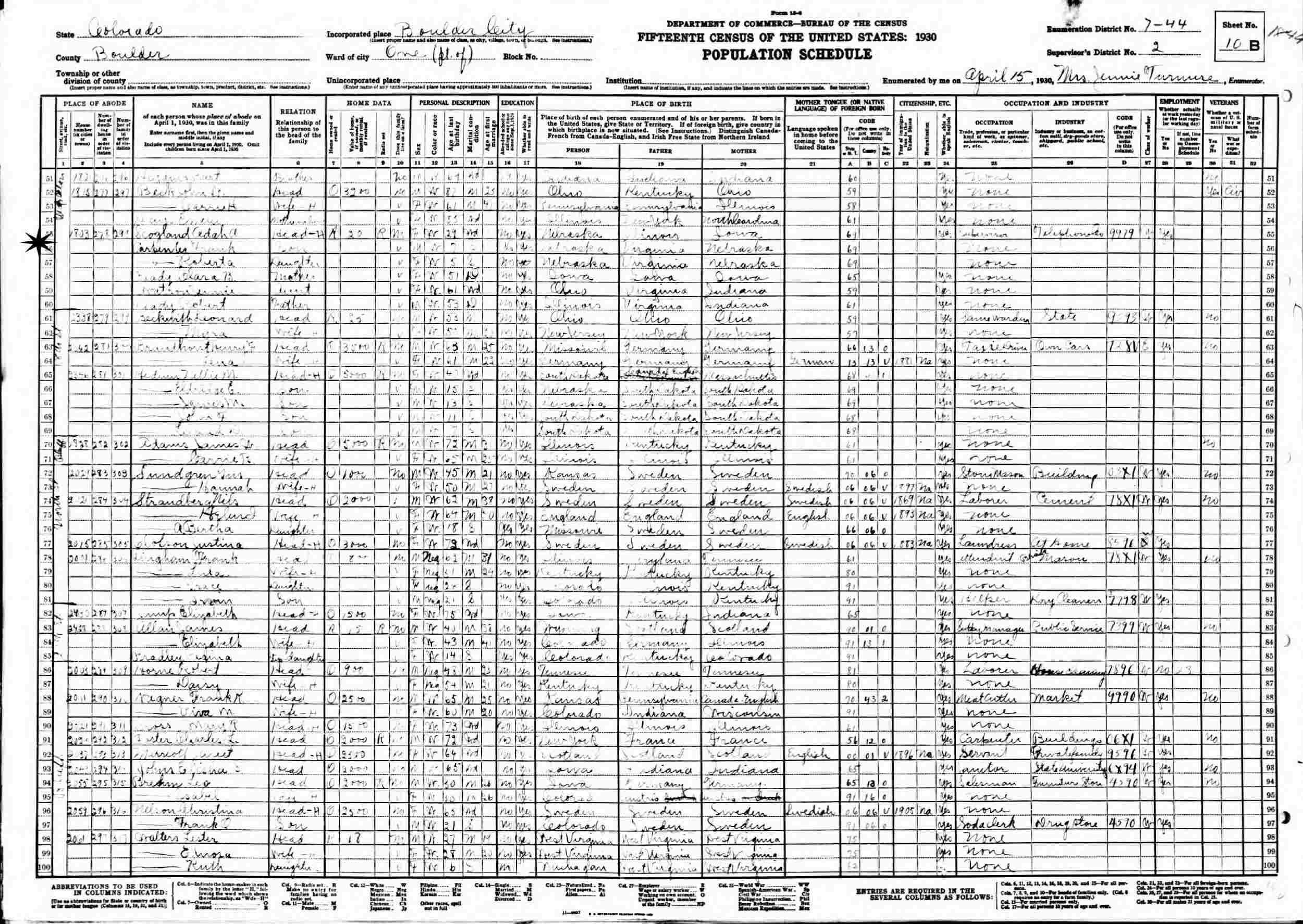 April 15, 1930 - Ward 1, Supervisor's District 2, Enumeration District 7-44, Boulder, Boulder, Colorado.