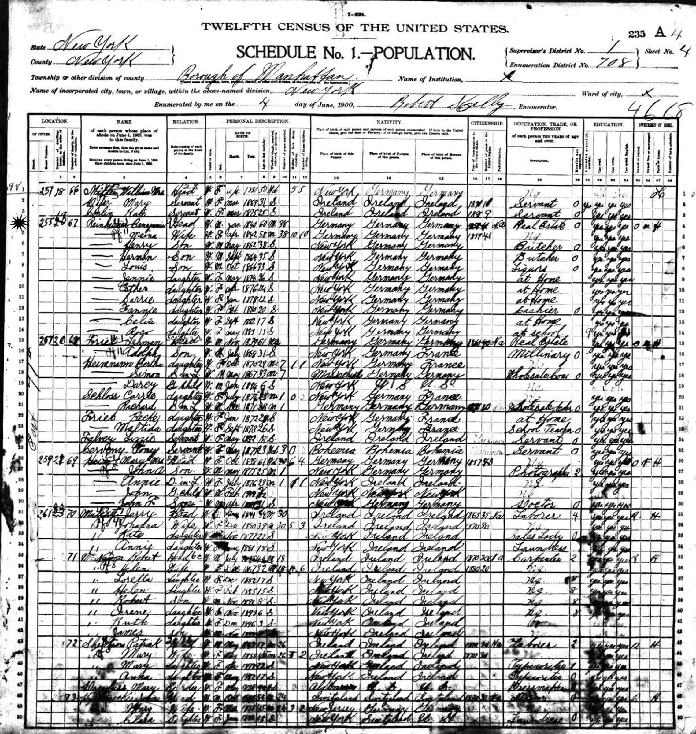 June 1, 1900 - 255 East 71st, Supervisor's District 1, Enumeration District 708, Manhattan, New York County, New York.