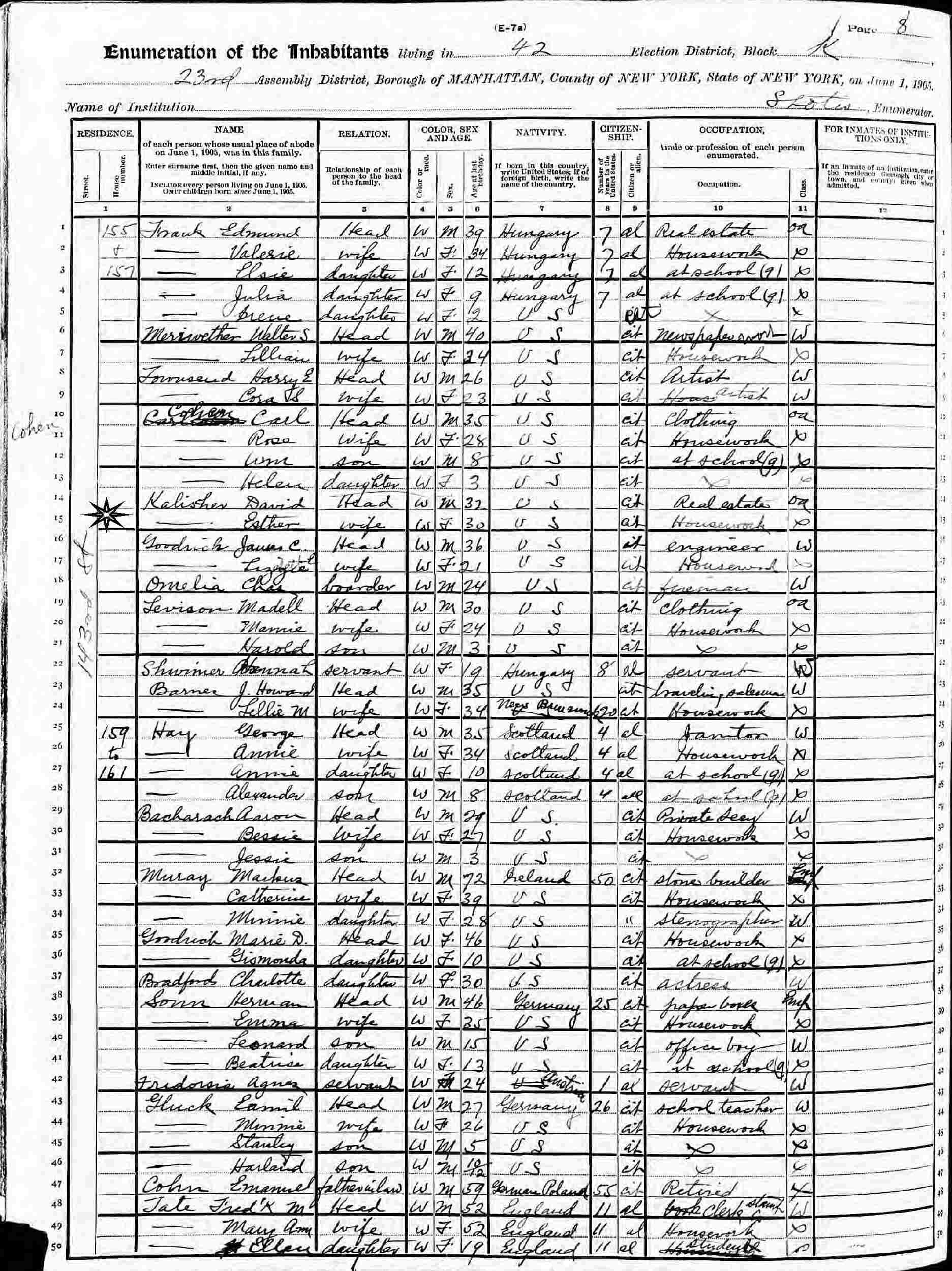 June 1, 1905 - 155-157 143rd Street, Assembly District 23, Election District 42, Block K, Manhattan, New York.