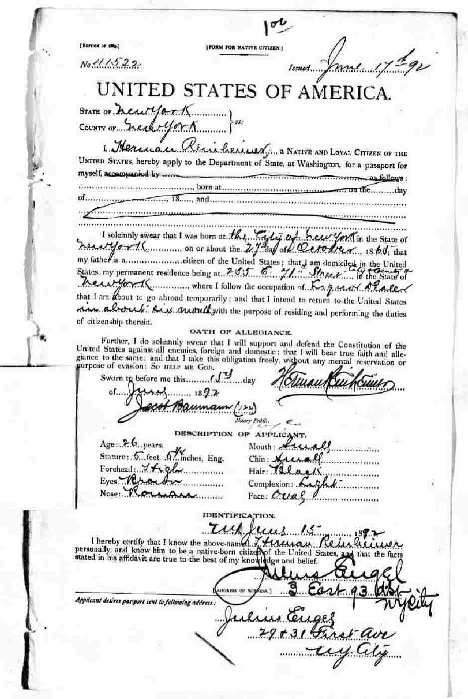 Passport Application: June 15, 1892.