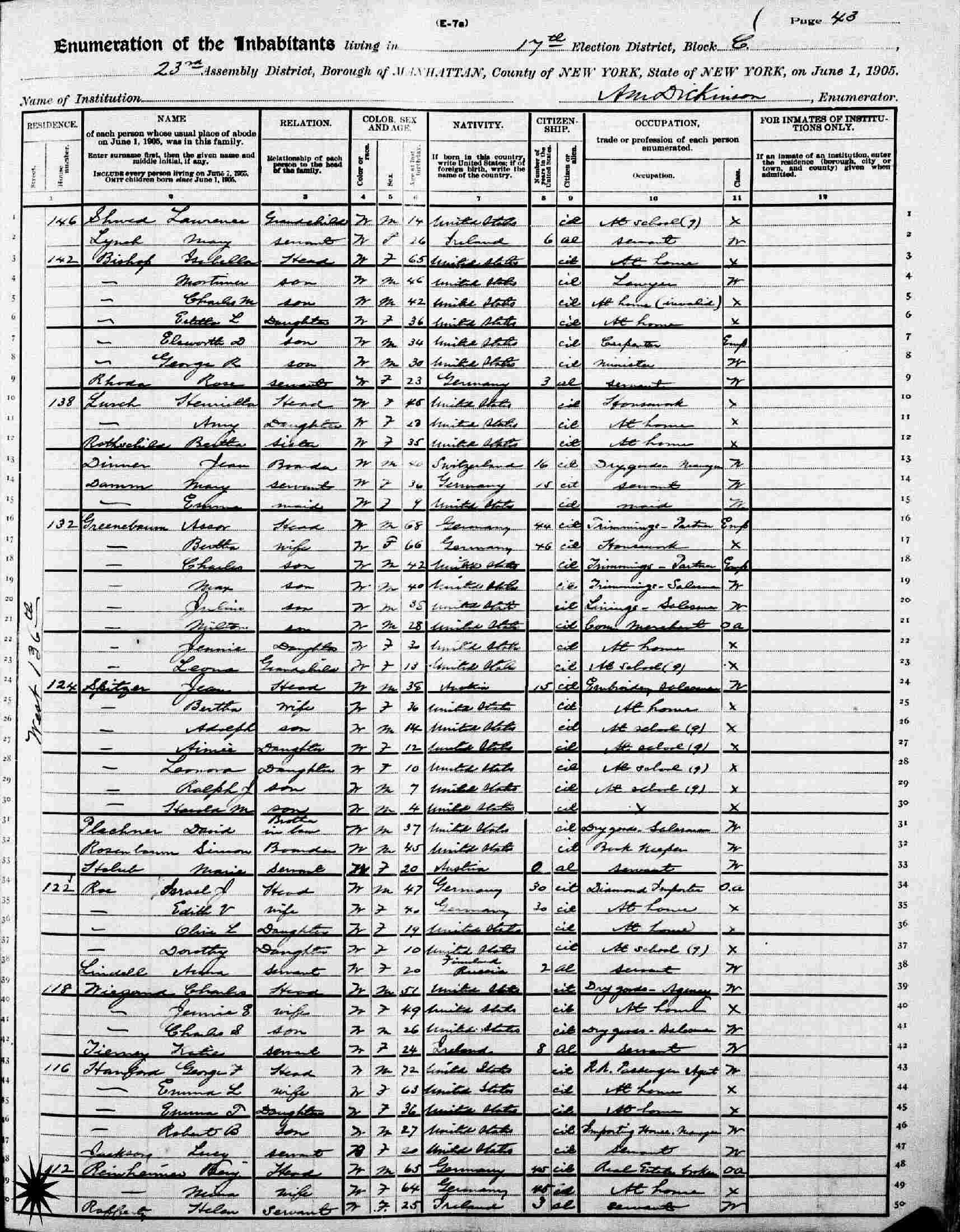 June 1, 1905 - New York State - NY State: 112 West 136th, 23rd Assembly District, 17th Election District, Block E, Manhattan, New York, New York.