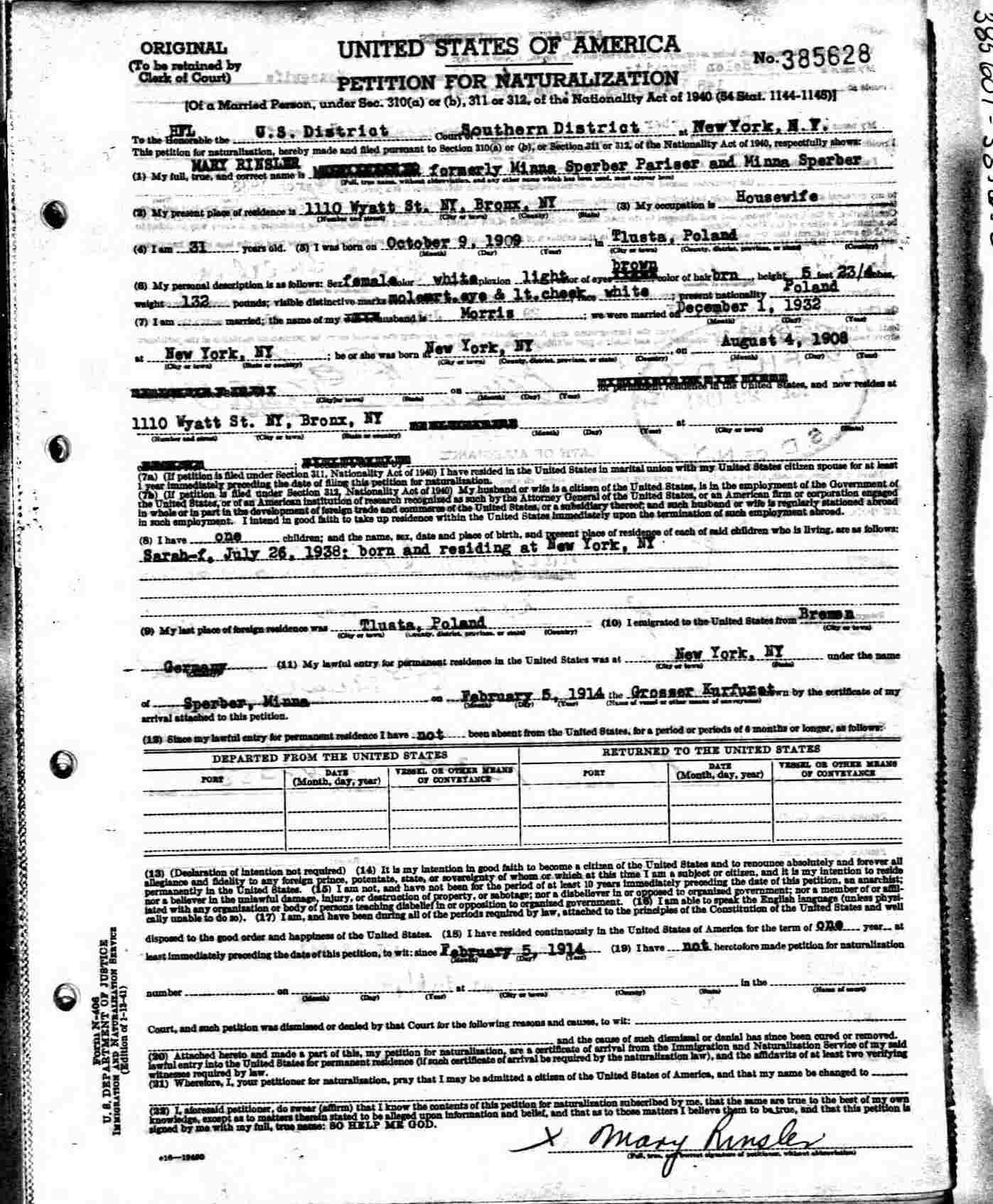 Notes for MARY "MINNA" SPERBER PARISER RINSLER: