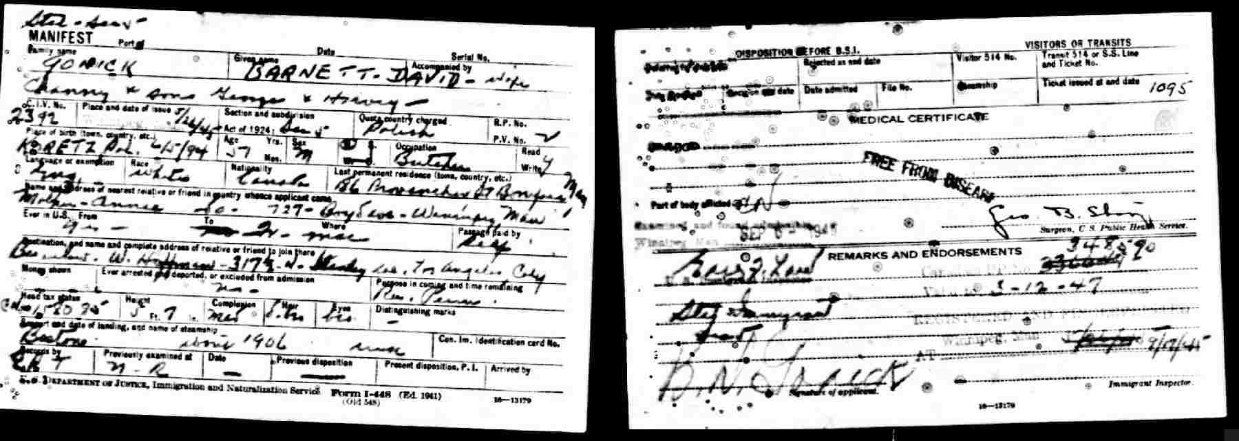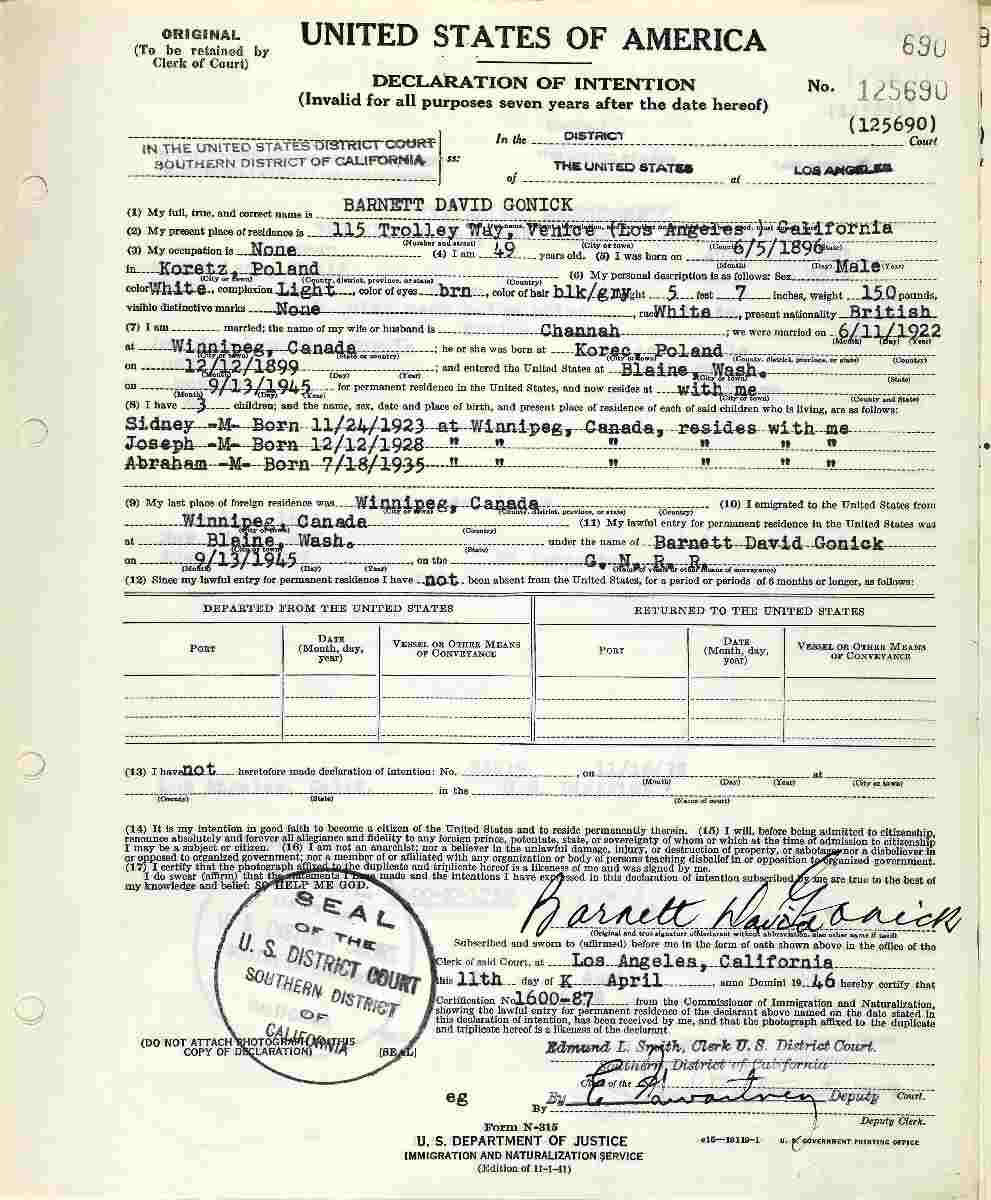 Notes for BARNETT "BARNEY" DAVID GONICK: