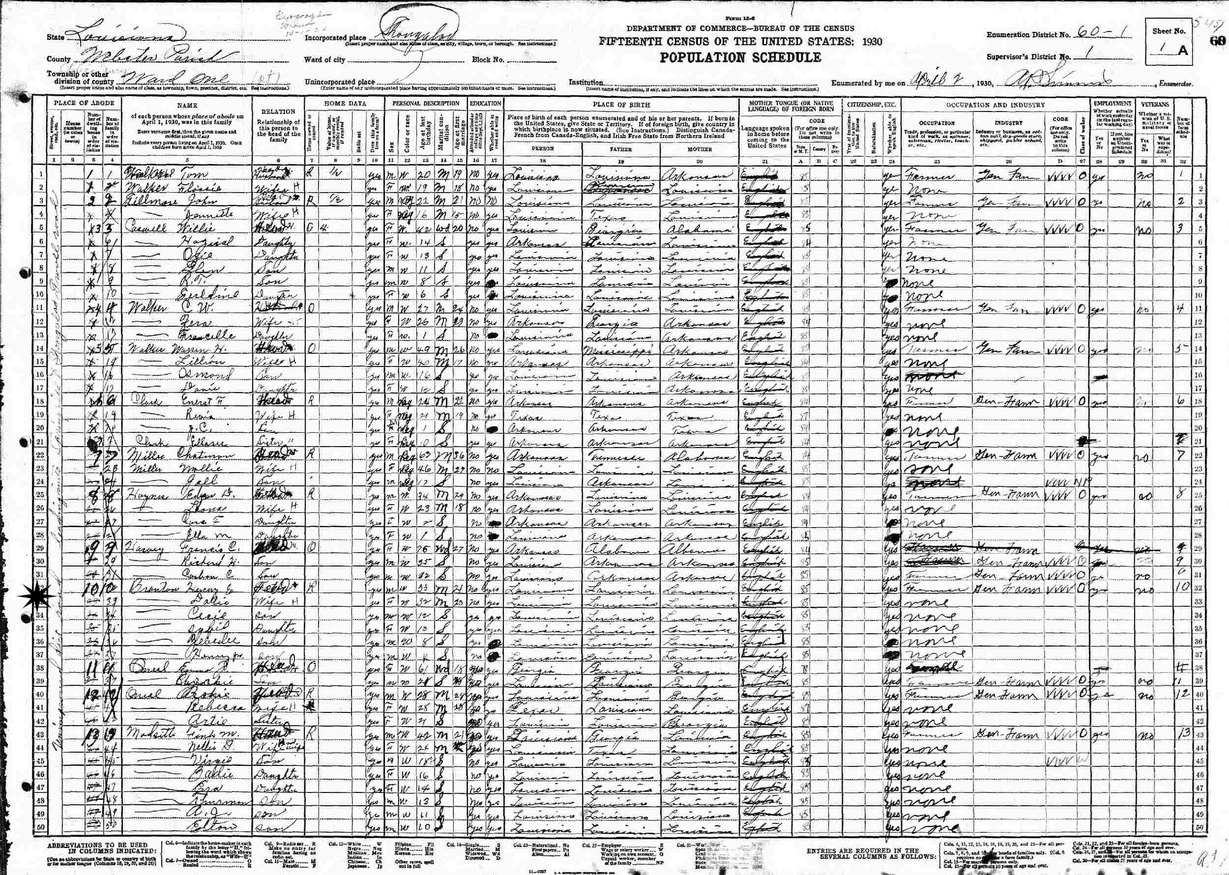 April 2, 1930 - Unimproved Dist. Road leading into Spring Hill and Strongolos Gravel Road, Police Jury Ward 1, Supervisor's District 1, Enumeration Distict 60-1, Shongaloo, Webster Parish, Louisiana.