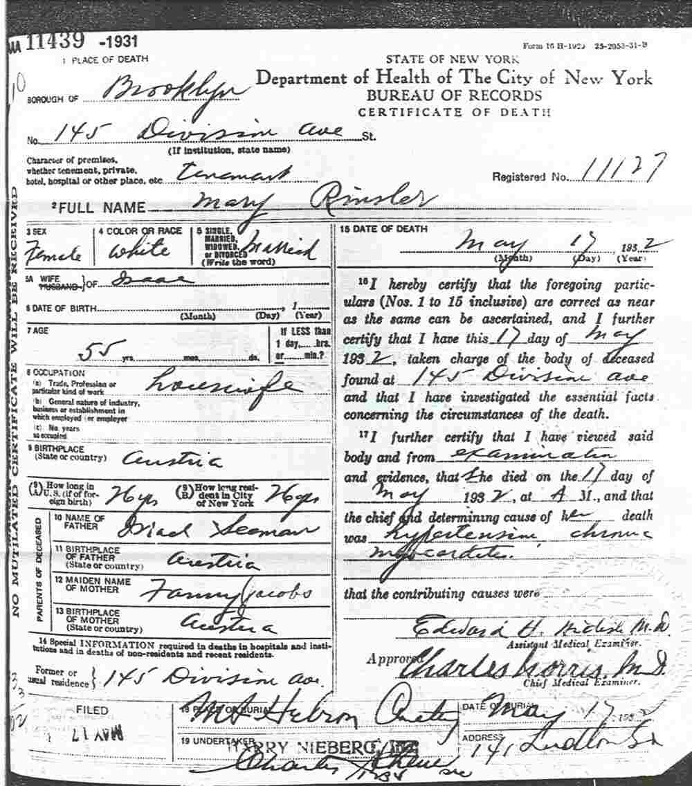 Residence at Time of Death: 145 Division St, Brooklyn, New York.