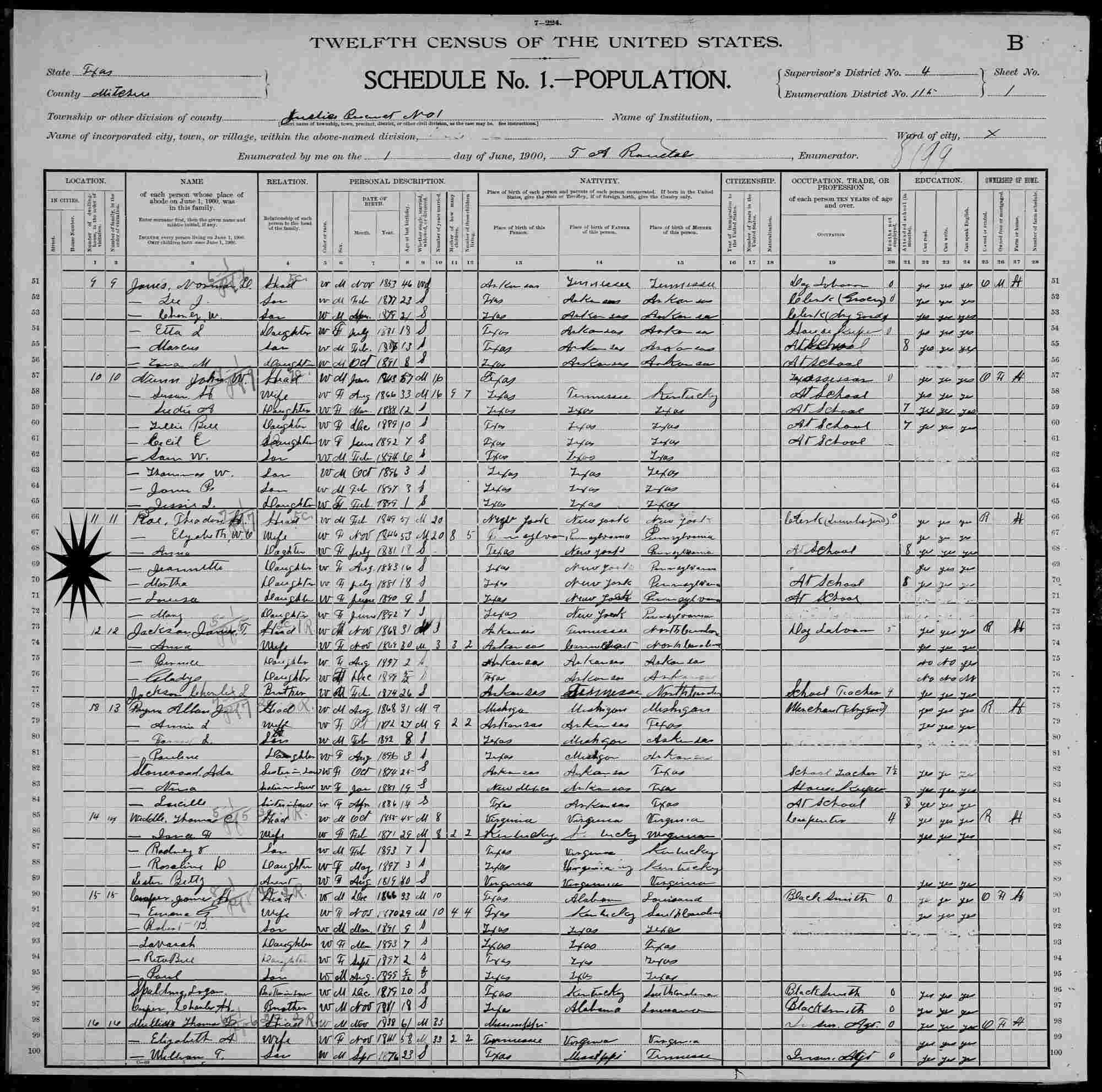 Census: 1900 - Justice Precinct 1, Mitchell County, Texas.