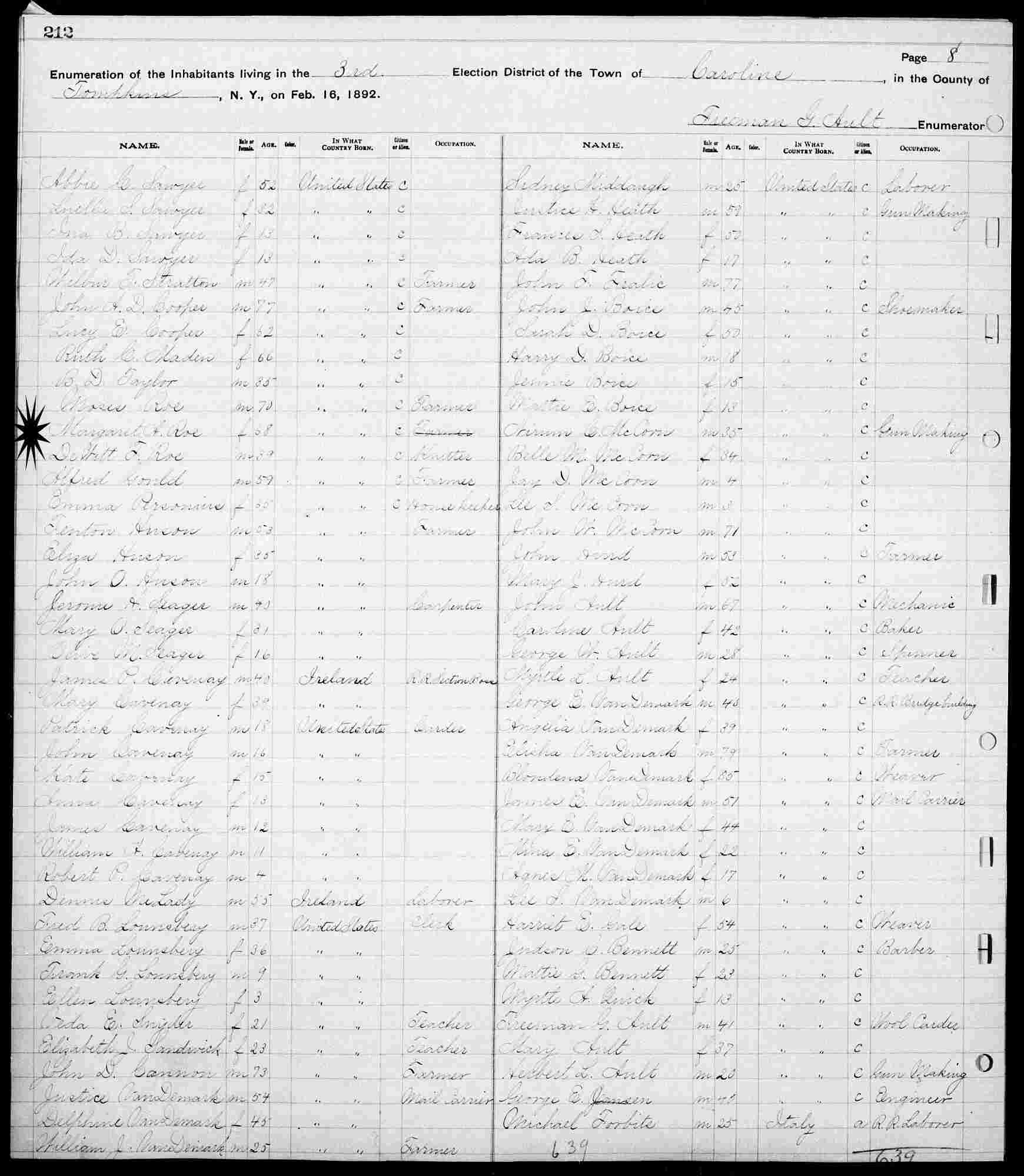 February 16, 1892 - E.D. 03, Caroline, Tompkins County, New York.