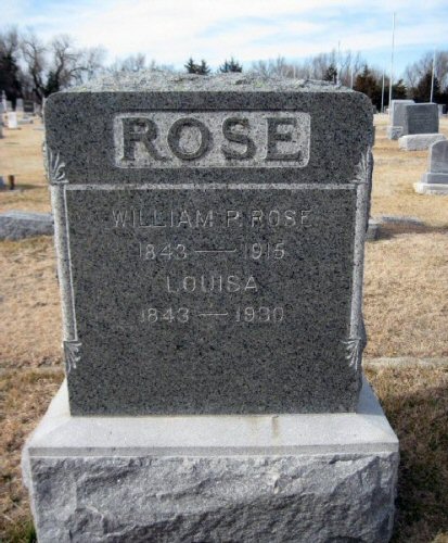 Notes for WILLIAM P ROSE: Son of ? and ?. Born: 1843 in Unknown. Died: 1915 in Unknown. Buried: Bennington Cemetery, Bennington, Ottawa County, Kansas. Married: Louisa Decker Unknown in Unknown.