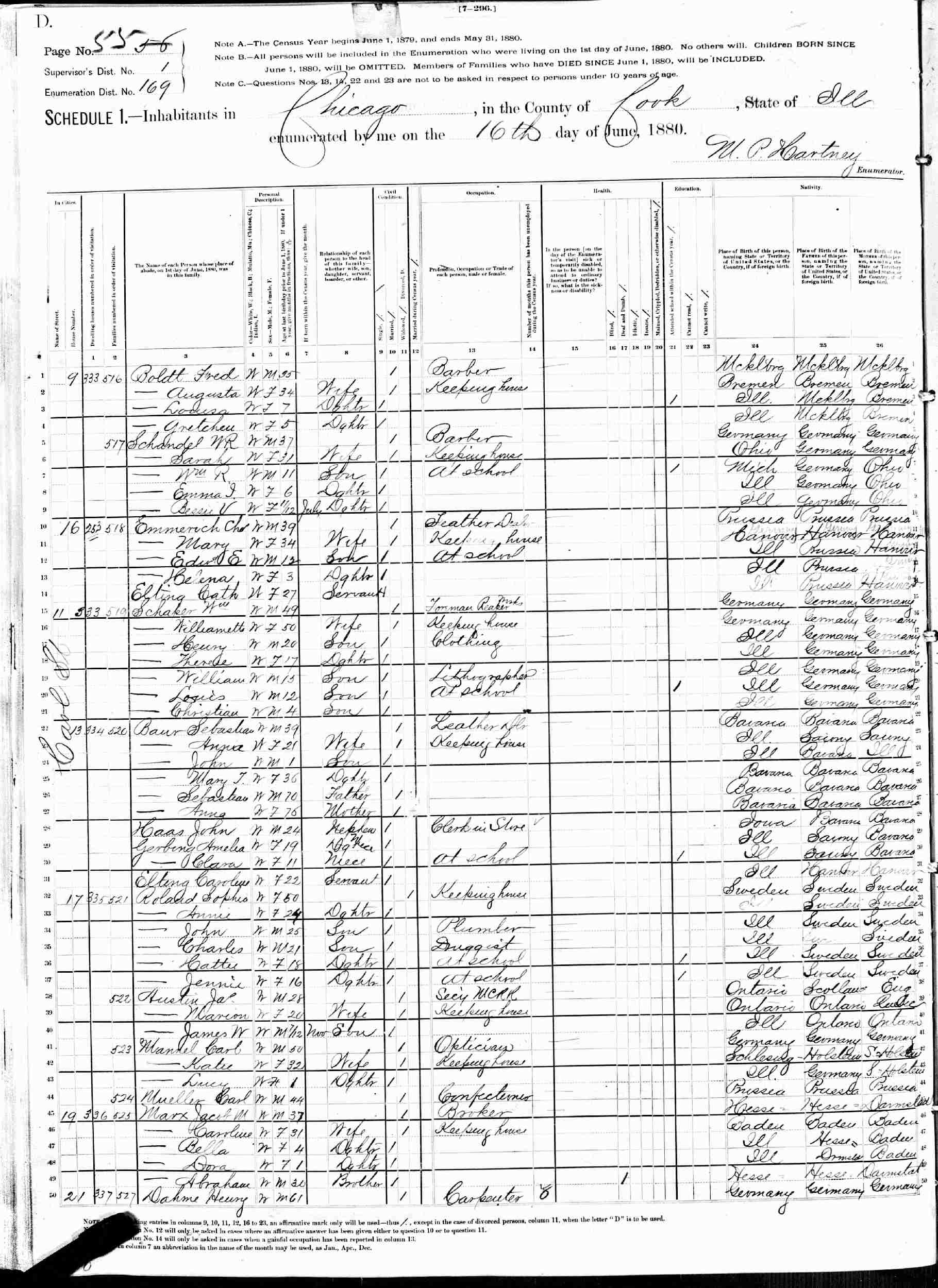 June 16, 1880 - 336 Carl Street, Supervisor's District 1, Enumeration District 169, Chicago, Cook County, Illinois.