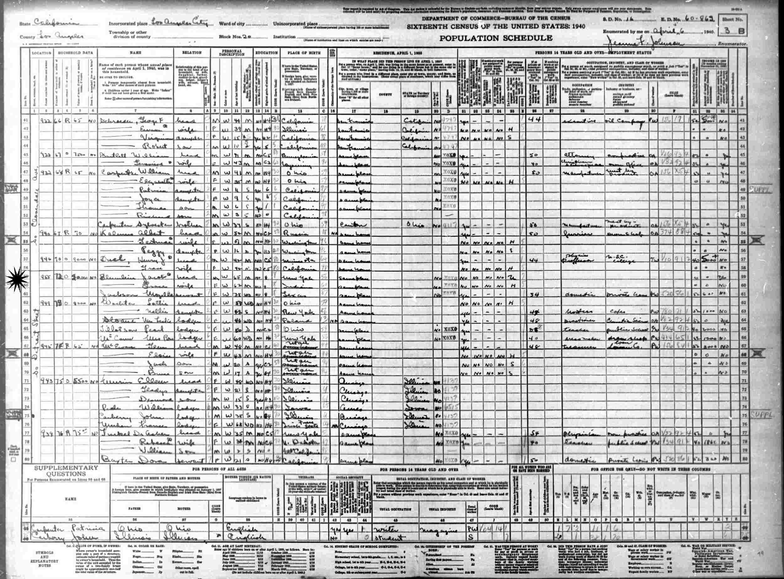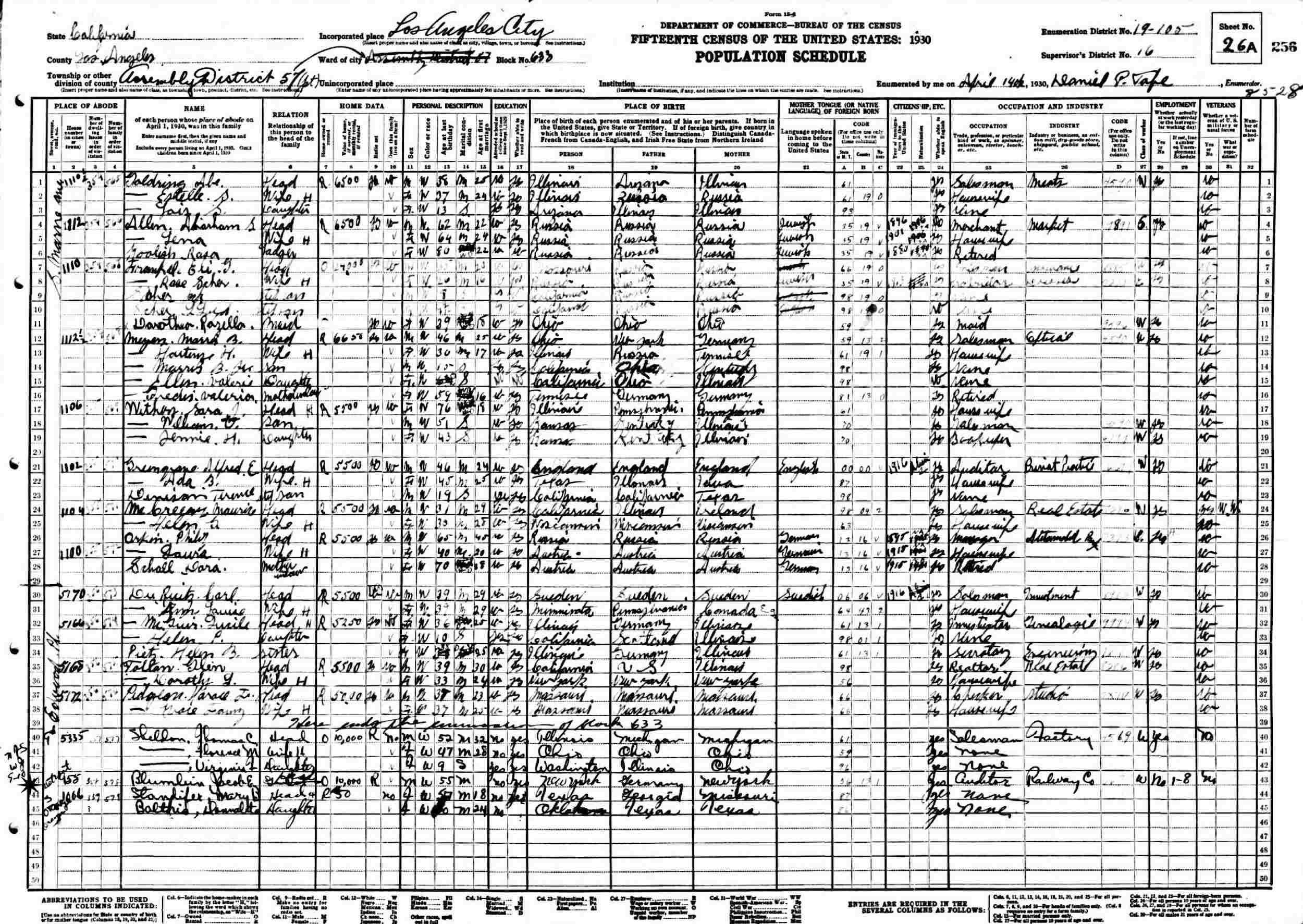 April 14, 1930 - 955 Edgewood Place, Assembly District 57, Block 633, Supervisor's District 16, Enumeration District 19-105, Los Angeles, Los Angeles County, California.