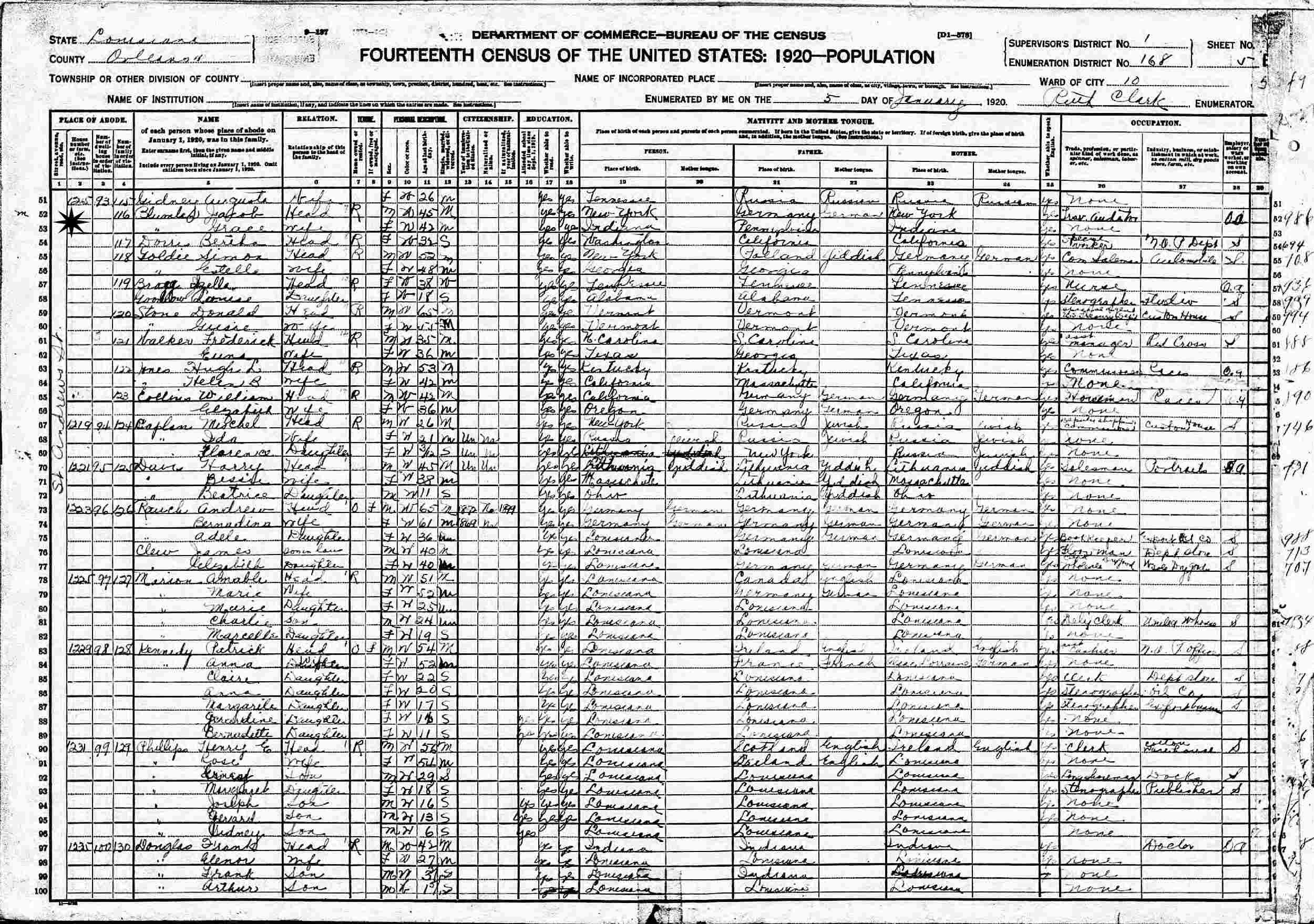January 5, 1920 - 1265 St. Andrews Street, Ward 10, Supervisor's District 1, Enumeration District 168, Orleans County, Lousiana.