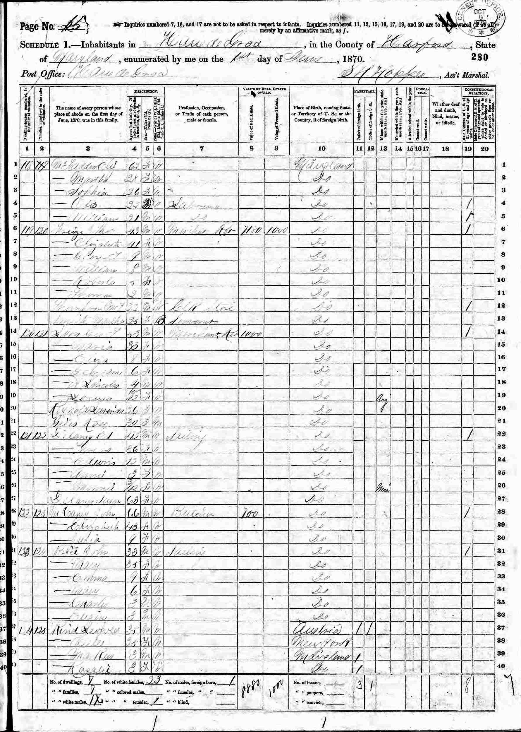 June 1, 1870 - Havre de Grace, Harford County, Maryland.