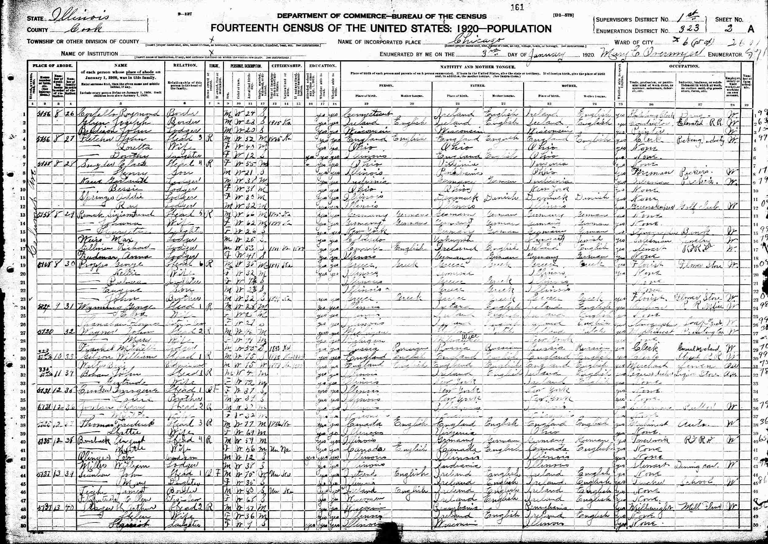 January 3, 1920 - 5136 Calumet Avenue, Ward 6, Supervisor's District 1, Enumeration District 323, Chicago, Cook County, Illinois (w/maternal grandparents).