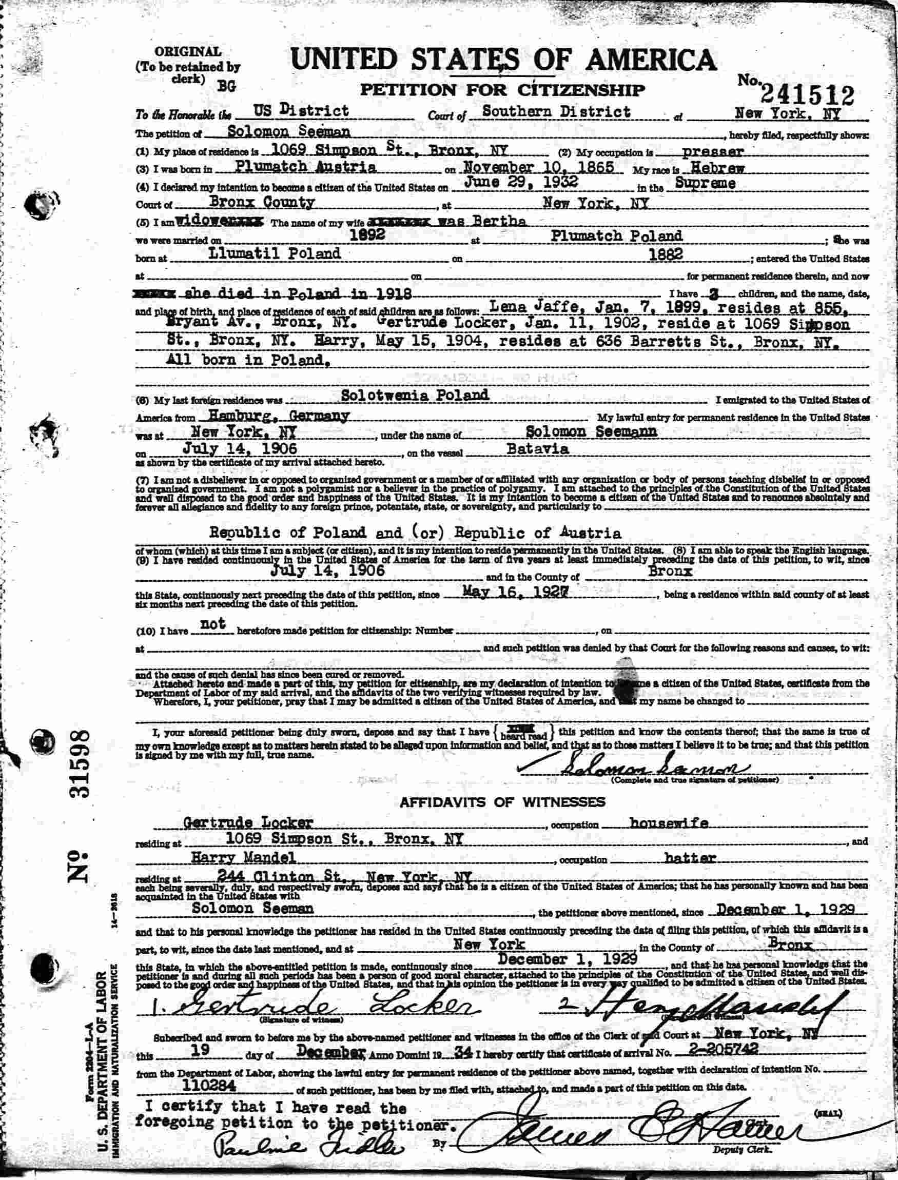 Petition For Naturalization: December 19, 1934.