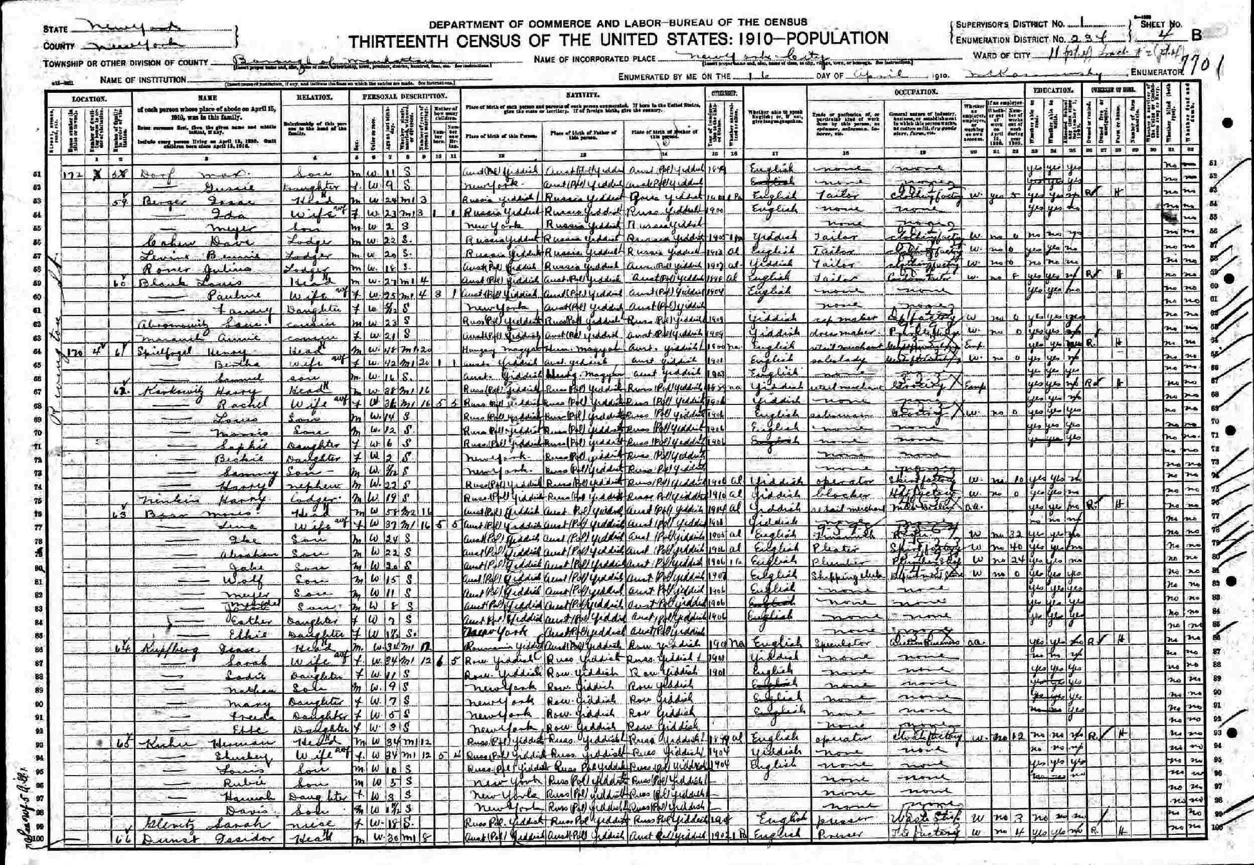 April 16, 1910: 172 Rivington Street, Part of Ward 11, Supervisor's District 1, Enumeration District 234, Manhattan, New York, New York.