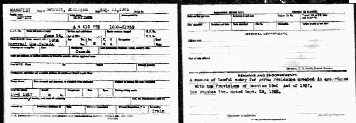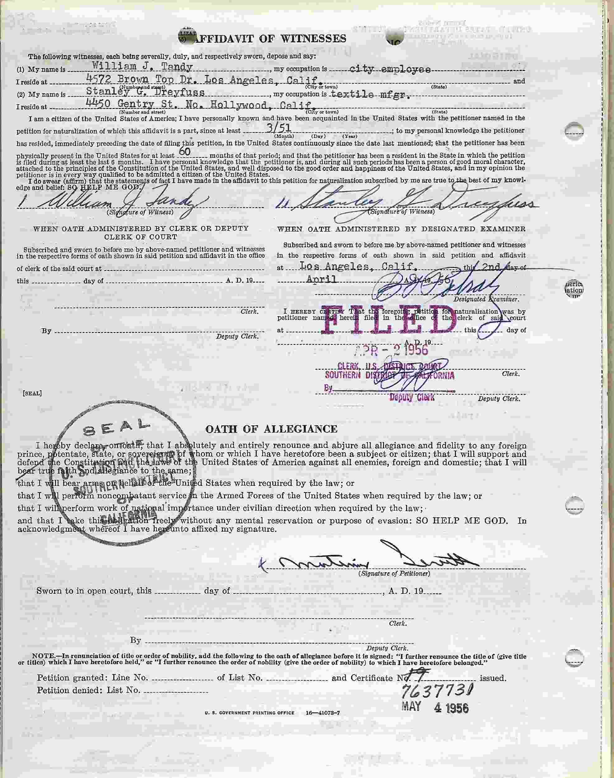 Naturalization: May 4, 1956 - U.S. District Court, Los Angeles, Los Angeles County, California.
