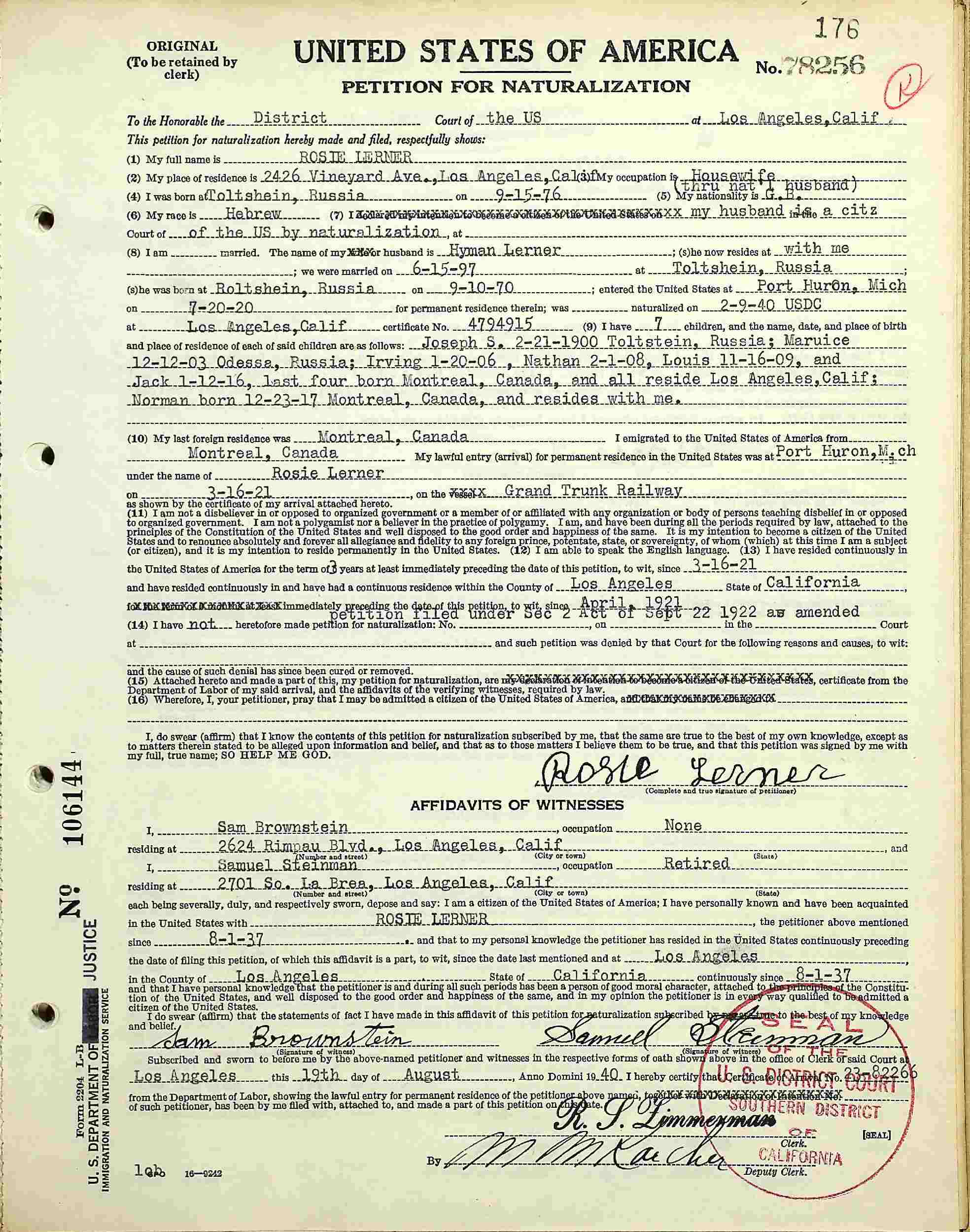 Petition For Naturalization: August 19, 1940, Los Angeles, Los Angeles County, California.