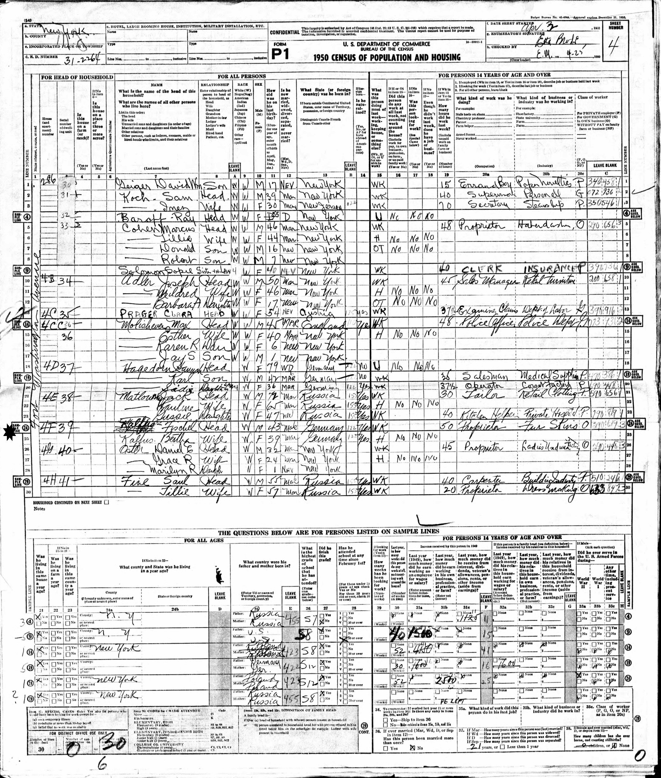 April 3, 1950 - 286 Fort Washington Avenue #4F, Enumeration District 31-2264, New York, New York.