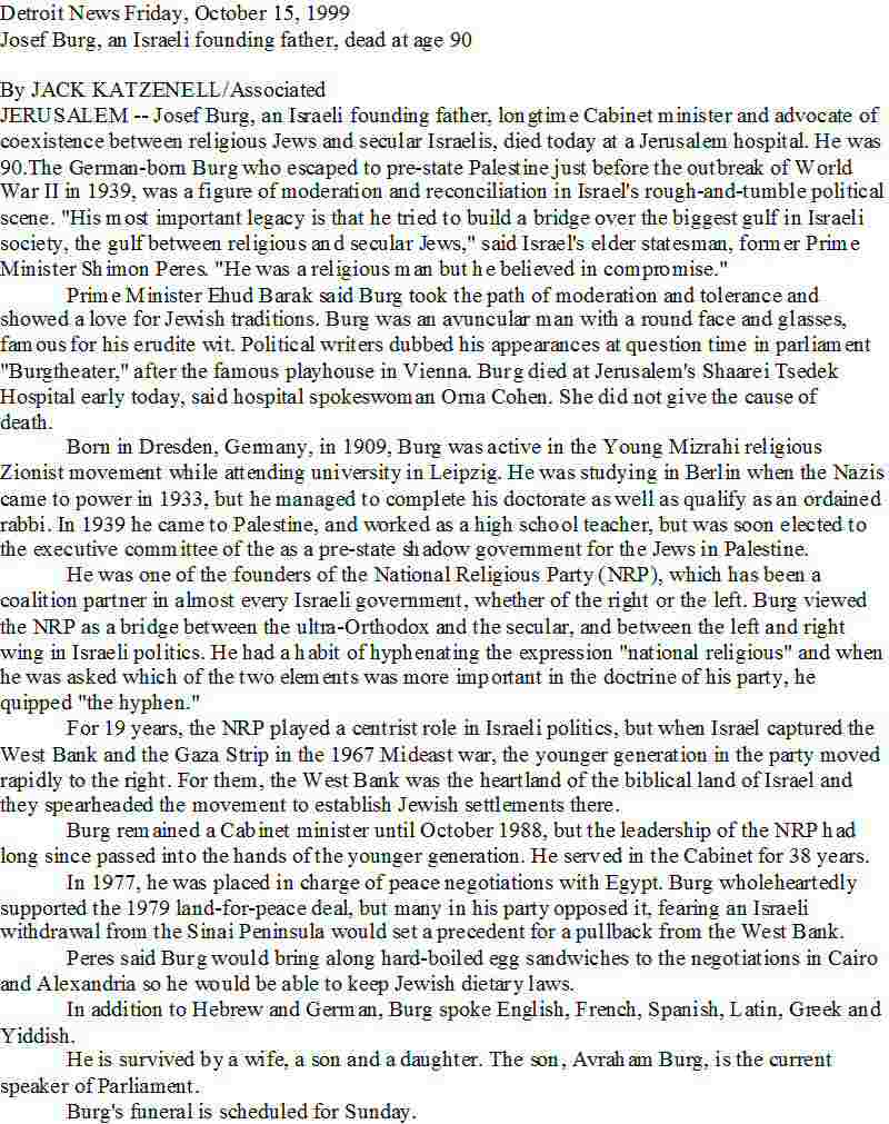 Josef Burg, an Israeli founding father, dead at age 90