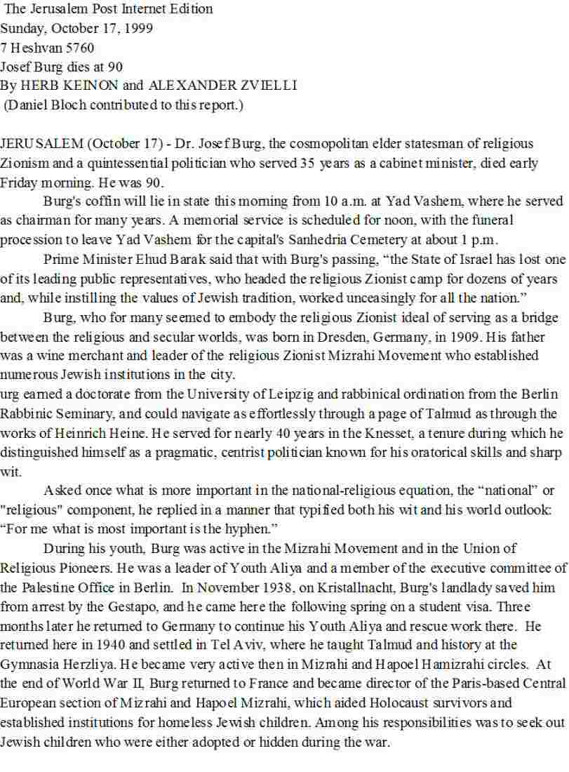 In addition to Hebrew and German, Burg spoke English, French, Spanish, Latin, Greek and Yiddish. He is survived by a wife, a son and a daughter. The son, Avraham Burg, is the current speaker of Parliament. Burg's funeral is scheduled for Sunday.