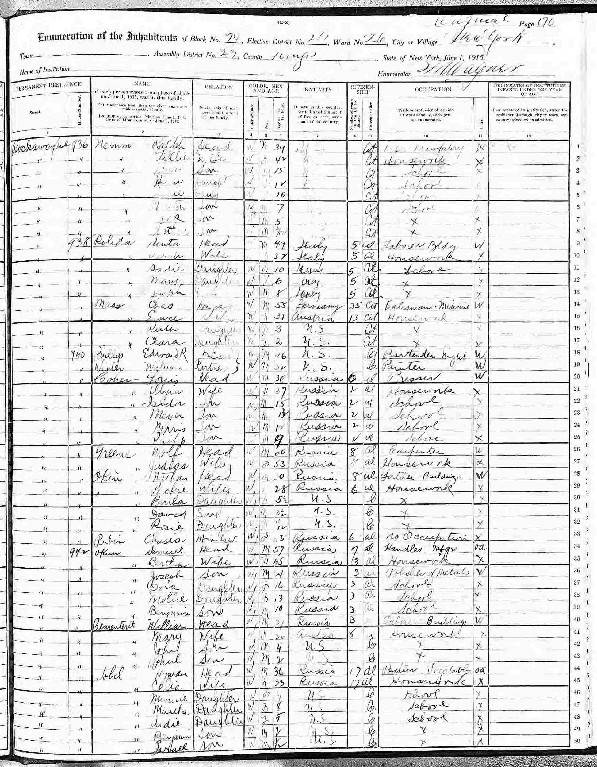 June 1, 1915 - New York State - 942 Rockaway Avenue, Block 74, Election District 211, Assembly District 23, New York City, Kings County, New York.