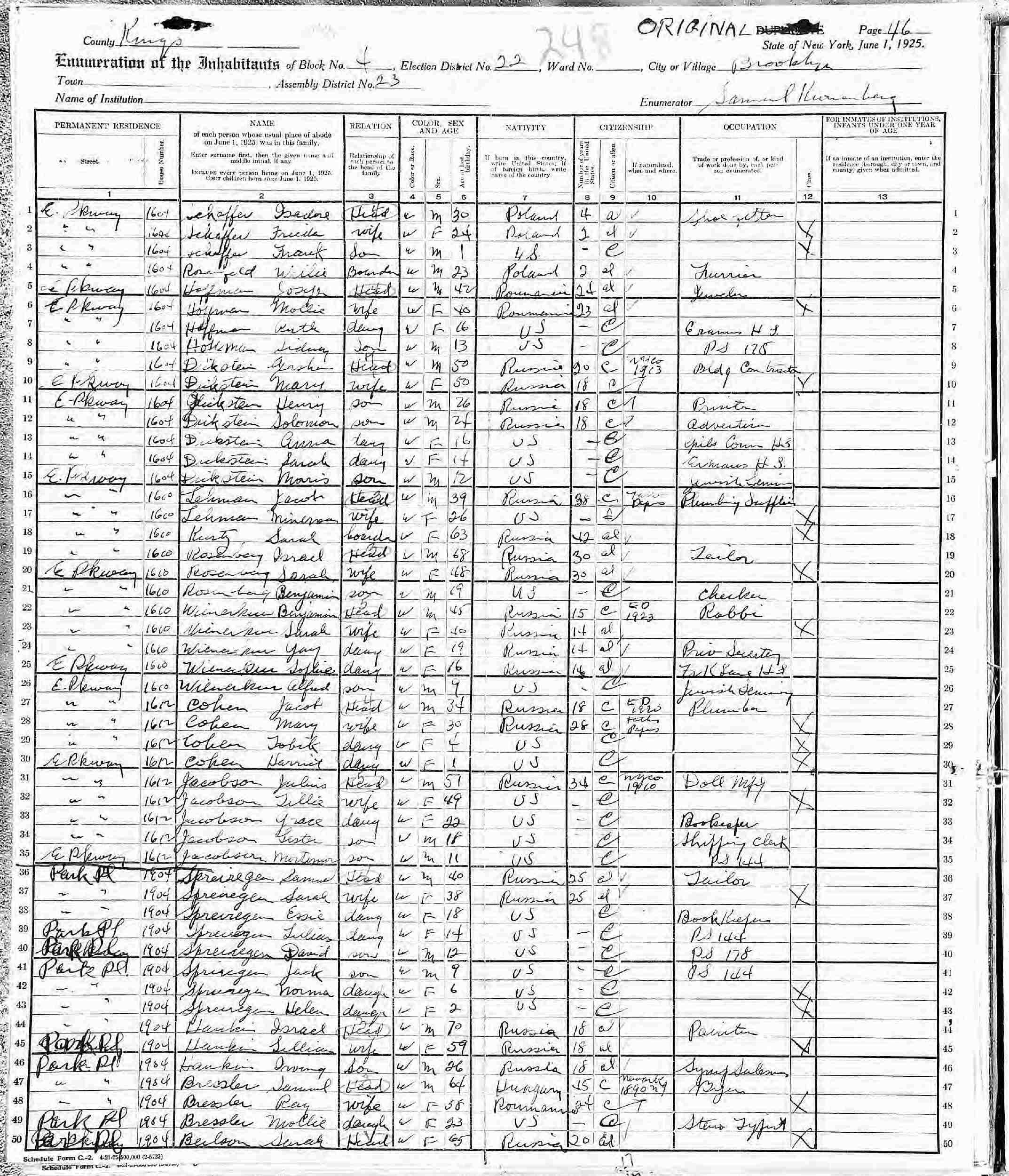 June 1, 1925 - New York State - 1612 East Parkway, Block 4, Election District 22, Assembly District 23, Brooklyn, Kings County, New York.