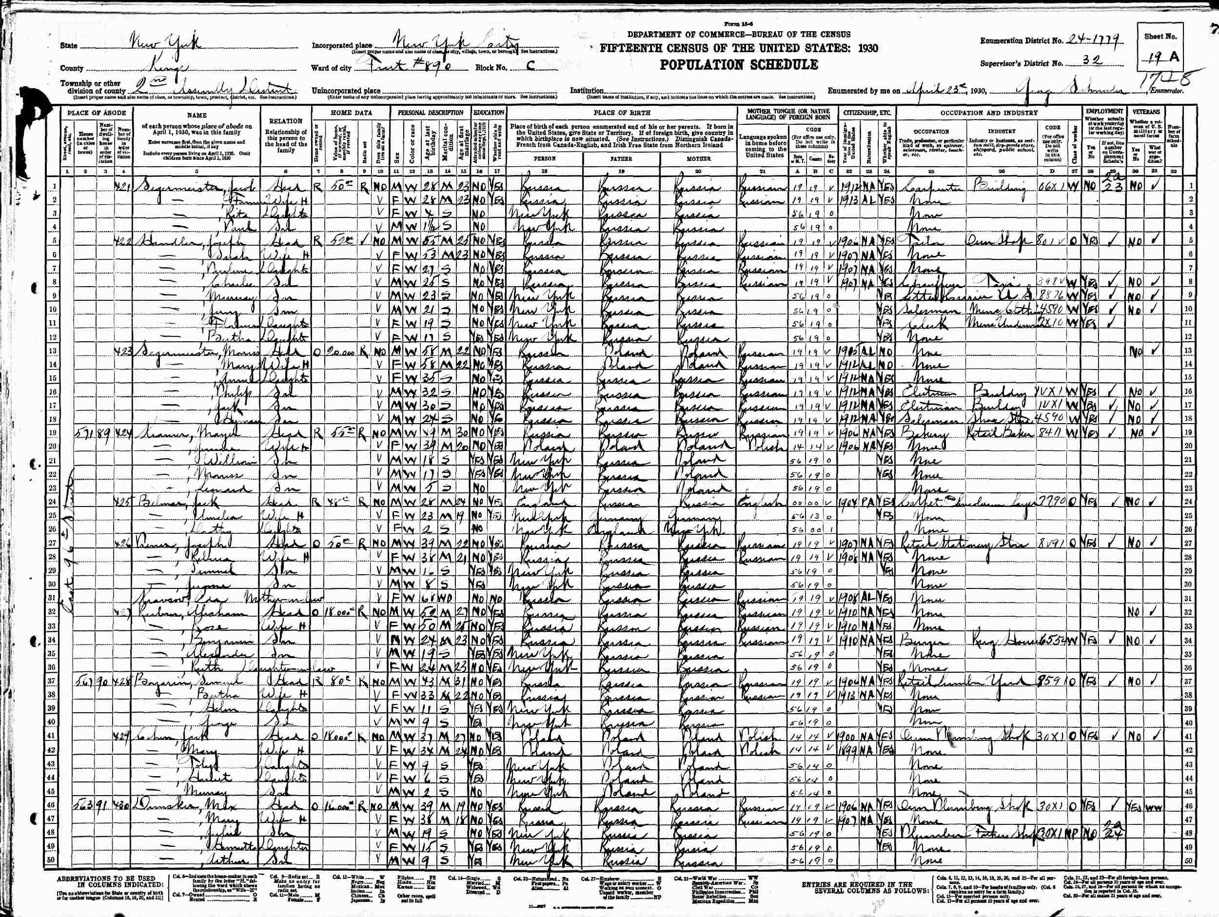 April 23, 1930 - 561 East 96th Street, Assembly District 2, Tract 890, Block C, Supervisor's District 32, Enumeration District 24-1779, Brooklyn, Kings County, New York.
