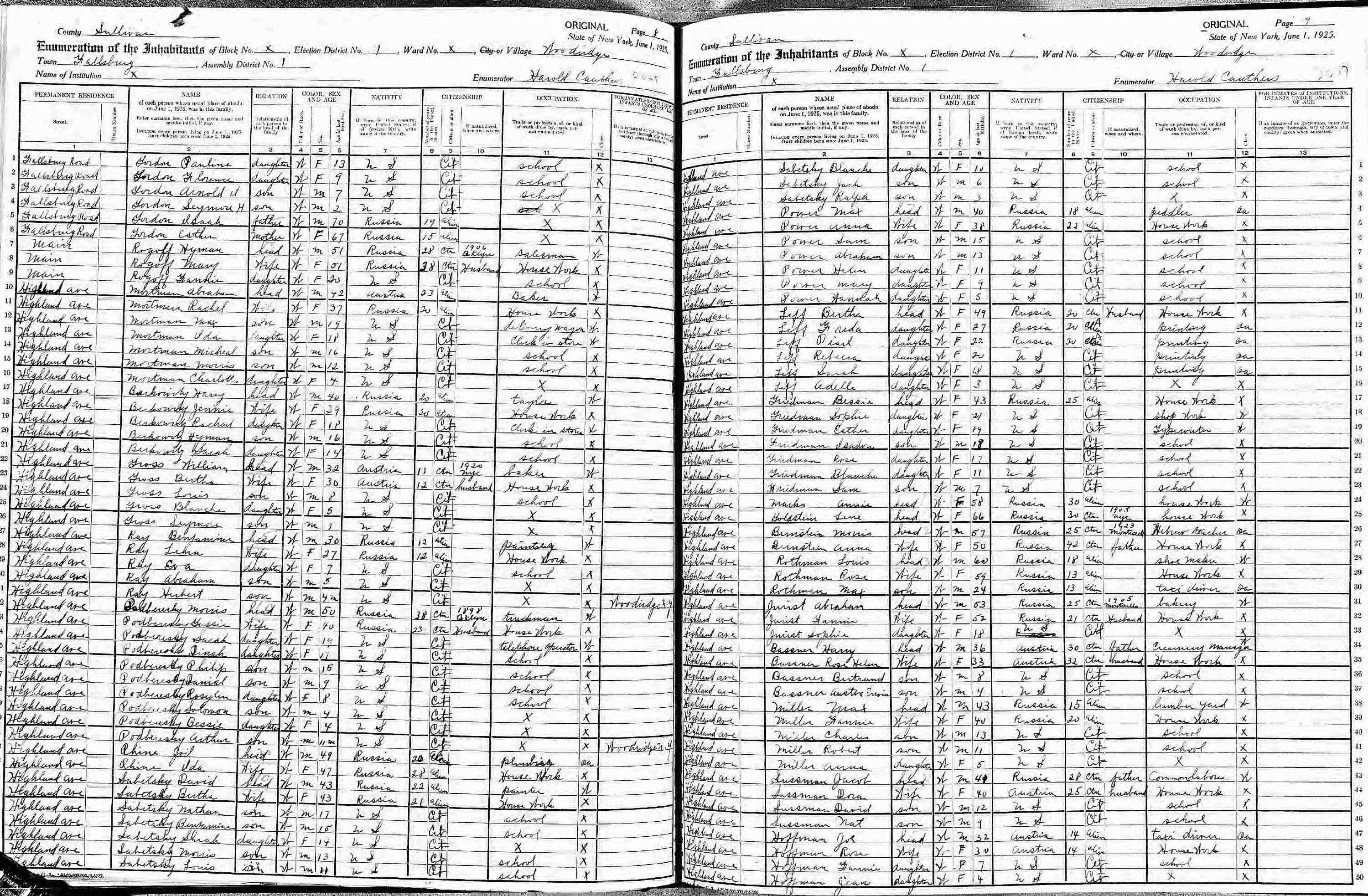June 1, 1925 - New York State - Highland Avenue, Election District 1, Assembly District 1, Fallsburg, Sullivan County, New York.
