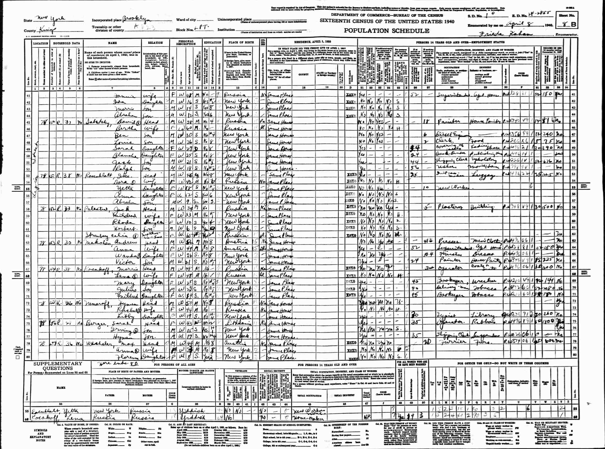 April 8, 1940 - 78 Legion Street, Assembly District 23, Block L, Supervisor's District 10, Enumeration District 24-2855, Brooklyn, Kings County, New York.