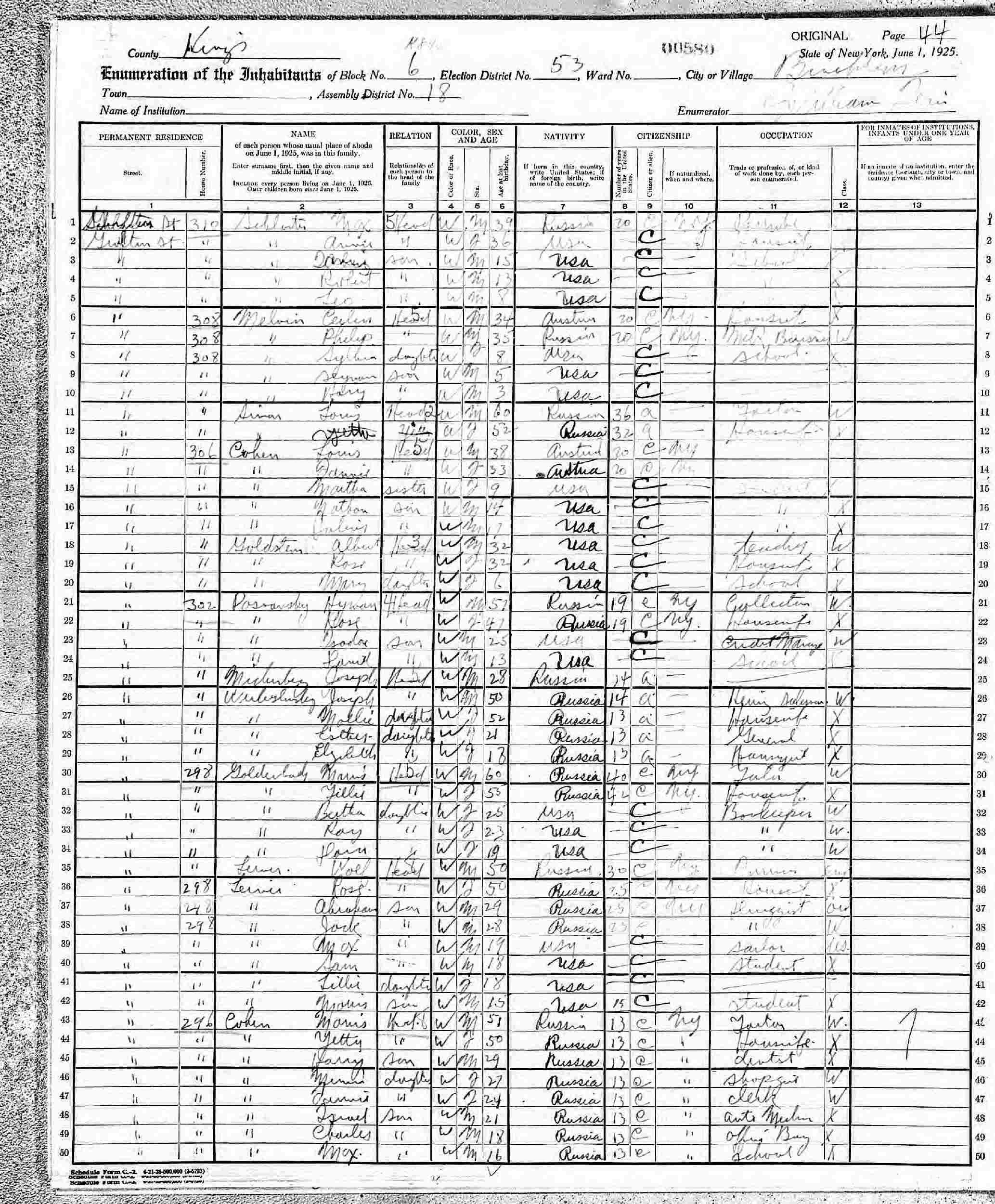 June 1, 1925 - New York State - 310 Grofton Street, Block 6, Election District 53, Assembly District 18, Brooklyn, Kings County, New York.