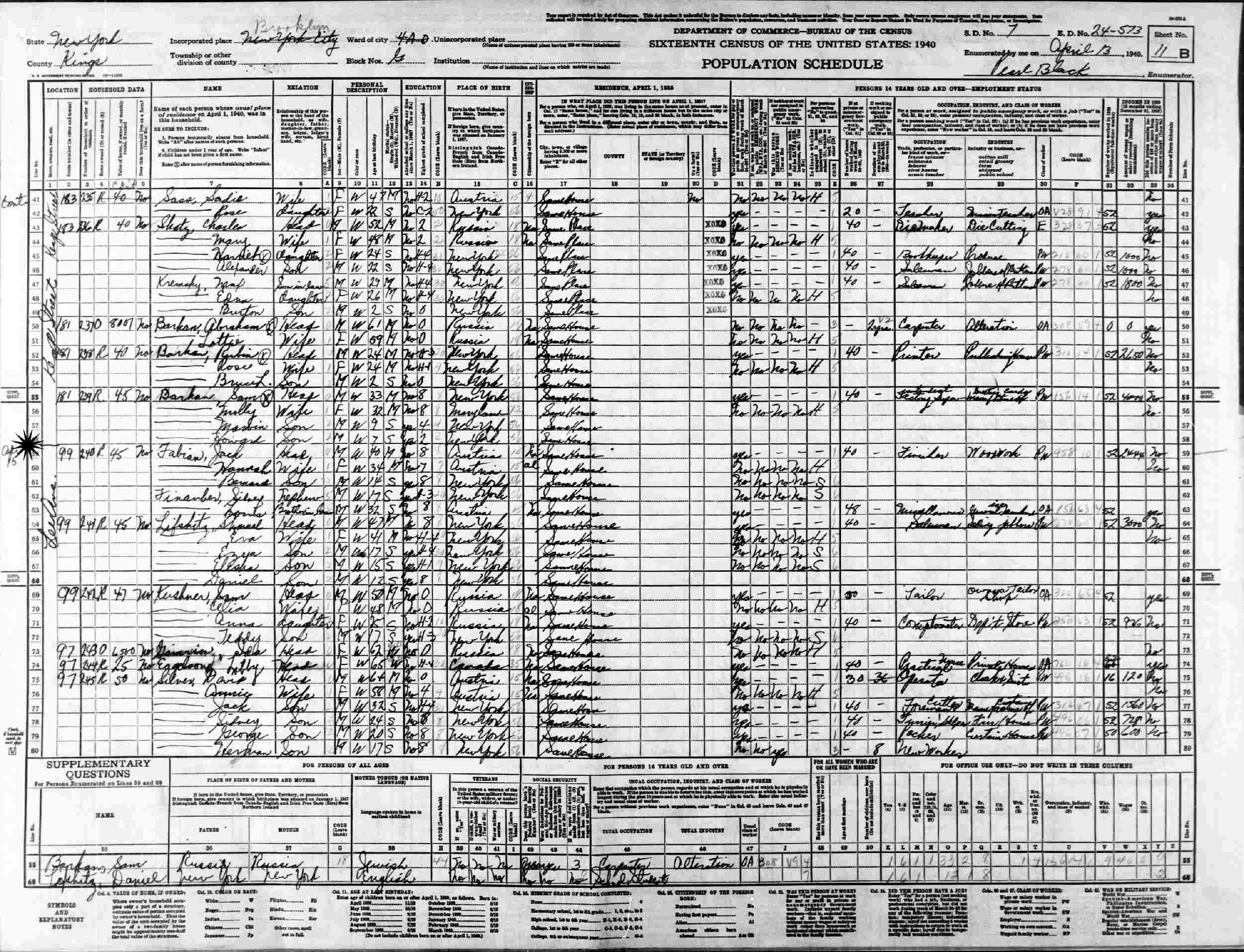 April 13, 1940 - 99 Lee Avenue, Assembly District 4, Block G, Supervisor's District 7, Enumeration District 24-573, Brooklyn, Kings County, New York.