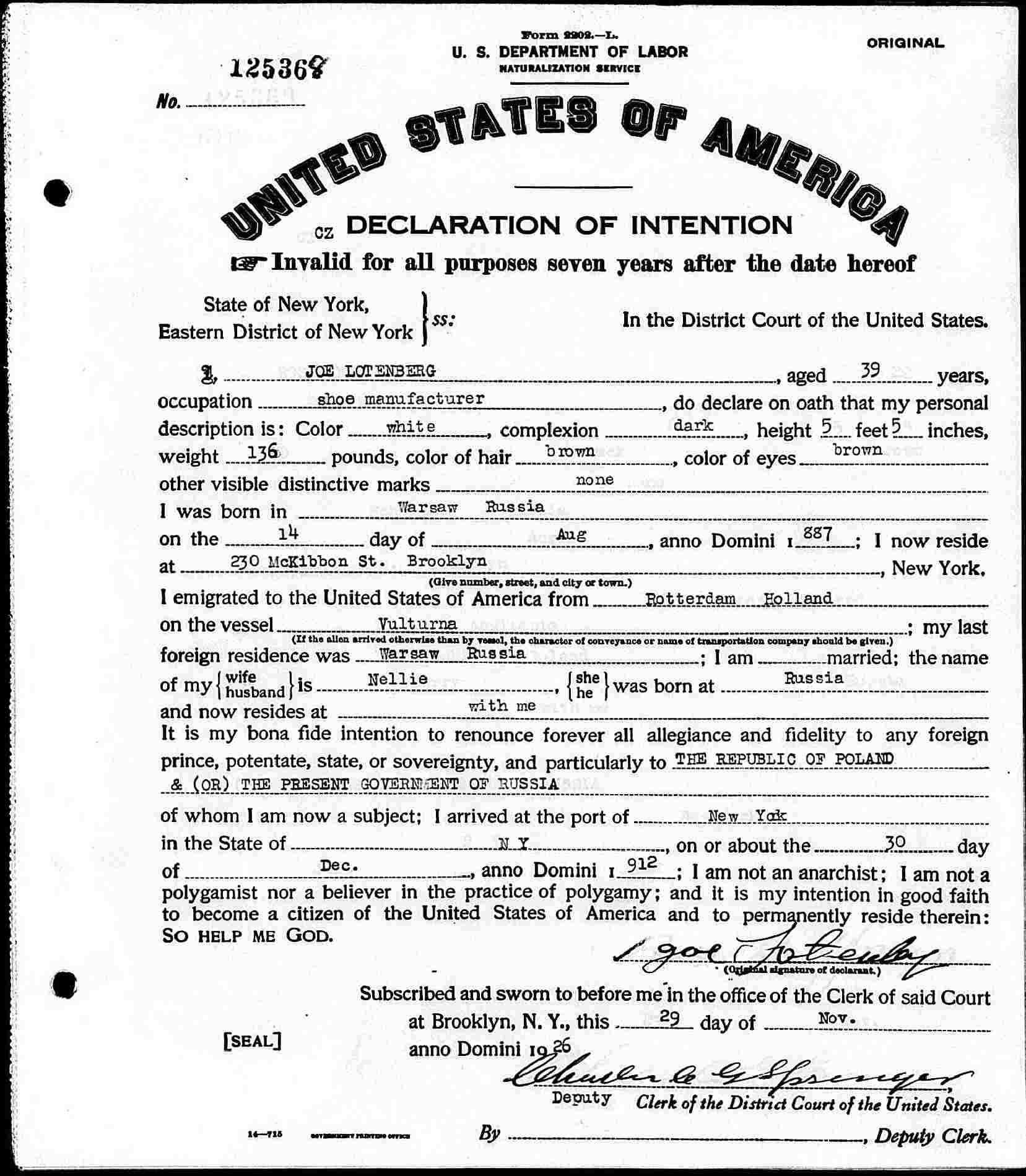 Declaration of Intention: November 29, 1926.