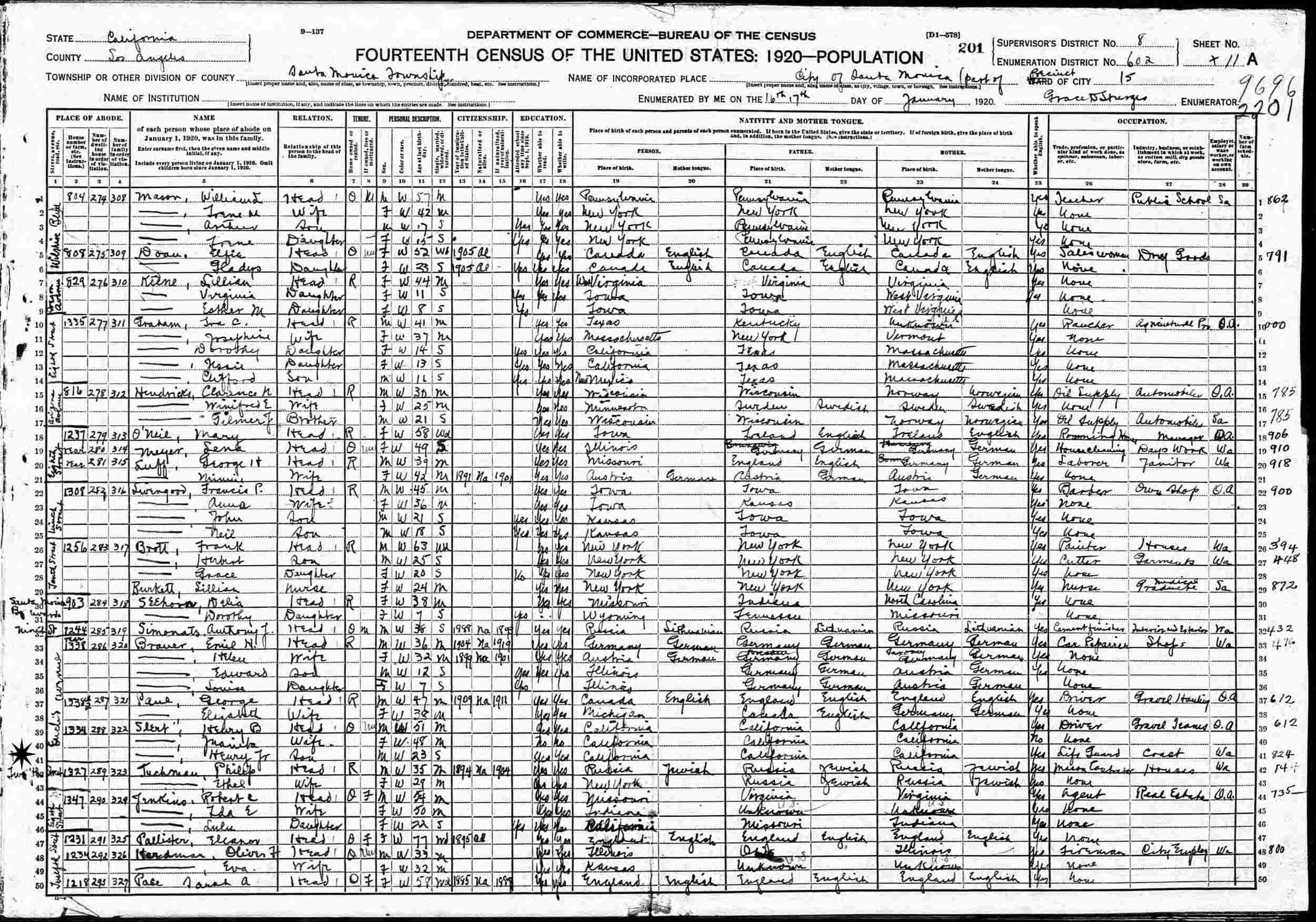 January 16-17, 1920 - 1327 T? Street, Precinct 15, Supervisor's District 8, Enumeration District 602, Santa Monica, Los Angeles County, California.
